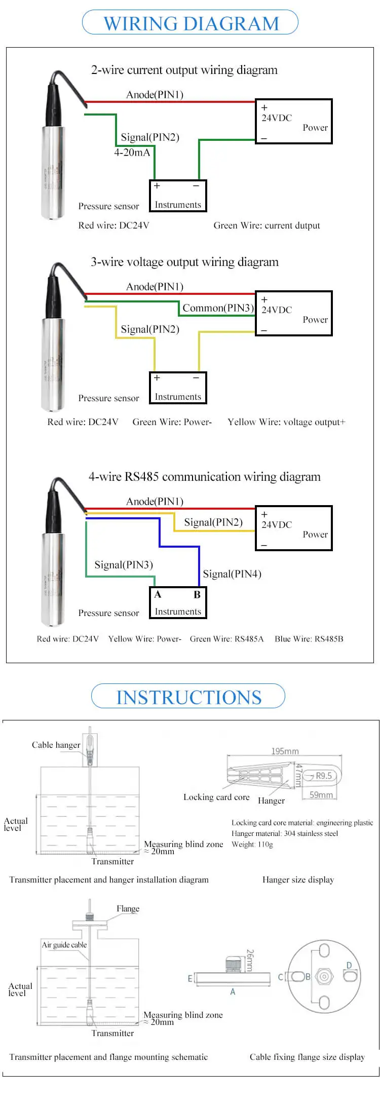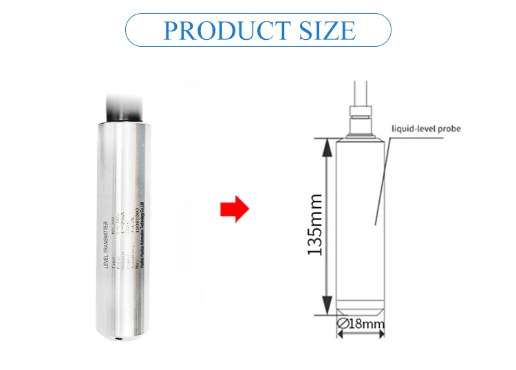 Погружной передатчик уровня, основанный на принципе, что гидро-статическое давление измеренного уровня пропорционально высоте этой жидкости, принимает Пьезорезистивный эффект диффузного кремния, преобразует давление в электрический сигнал, компенсация температуры и линейная калибровка, затем преобразует в стандартные сигналы и выходы тока, напряжения и RS485.