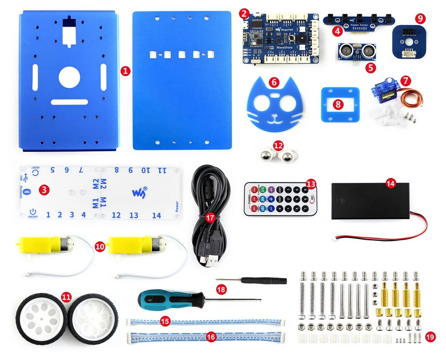 KitiBot оснащен контрольной доской Mega2560 и несколькими типичными Роботизированными функциональными модулями, включающими: Отслеживание линии, предотвращение препятствий, ультразвуковое переключение, сервопривод, ИК-пульт дистанционного управления и т. д.