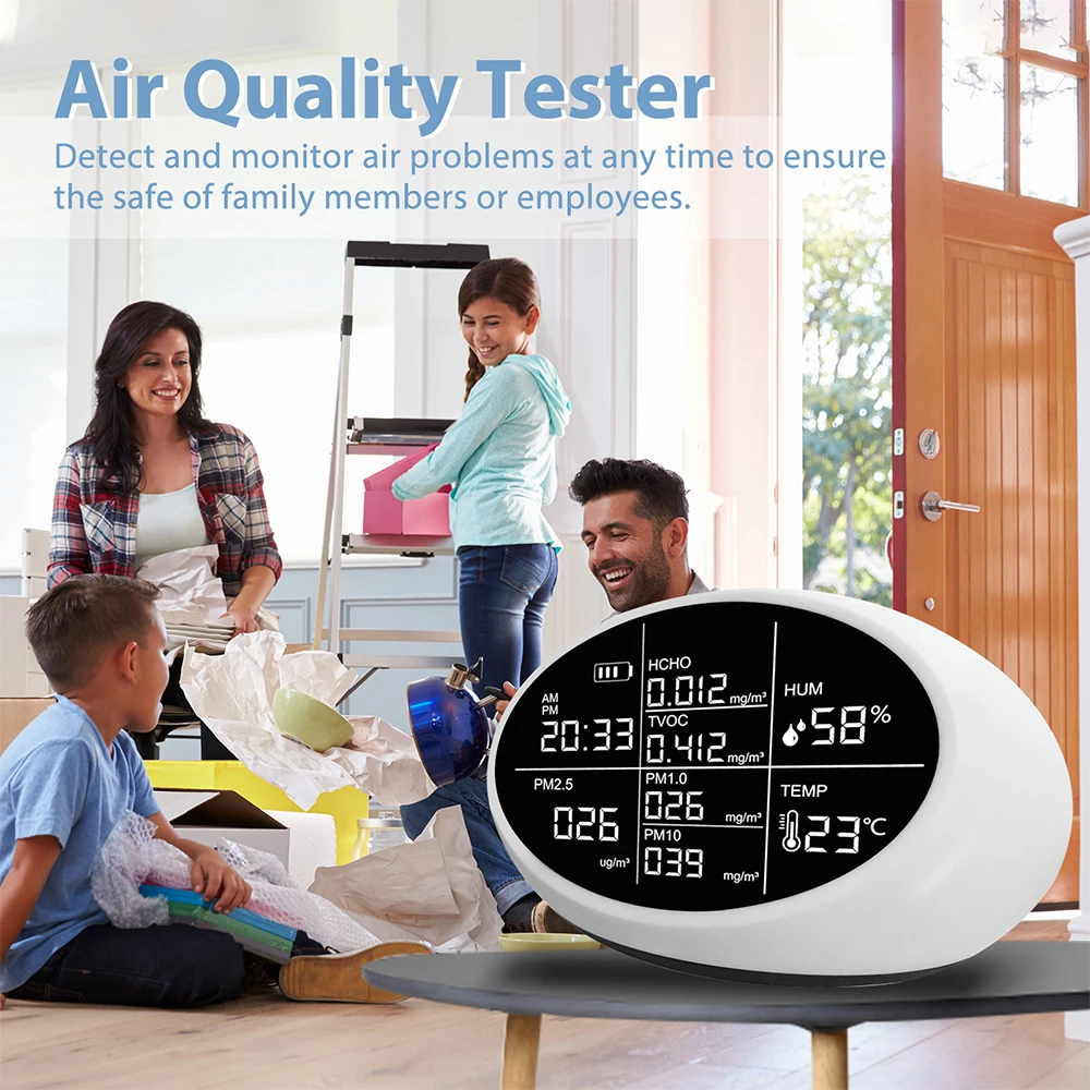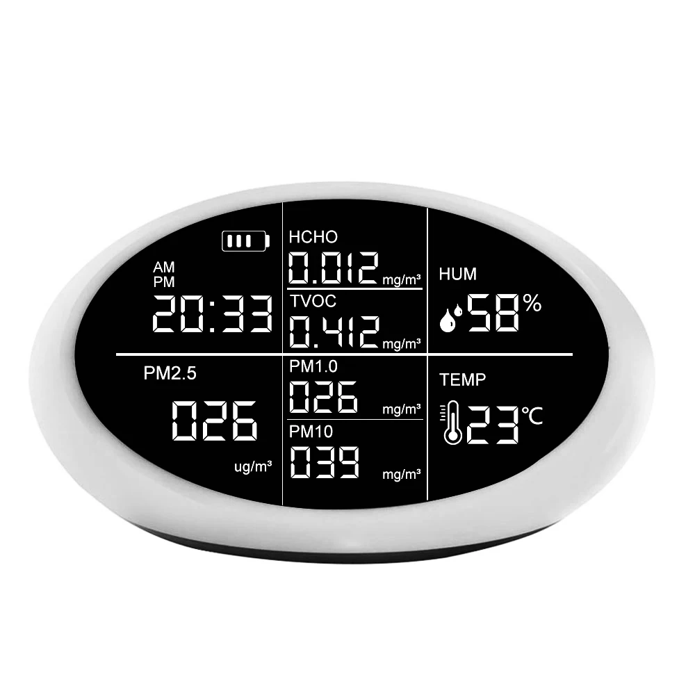 Может обнаруживать HCHO, TVOC, PM2.5, PM1.0, PM10, температуру, влажность, а также устанавливать и контролировать время воспроизведения.