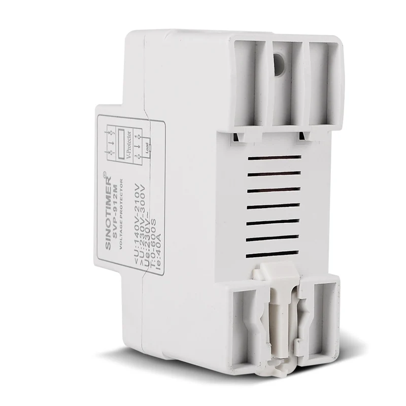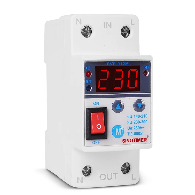 SVP-912M фирменный автоматический протектор от перенапряжения и пониженного напряжения SINOTIMER подходит для однофазного переменного тока 230 В, 50/60 Гц, номинального рабочего тока 40 А. Он в основном используется для бытовых коробок ввода или перенапряжения, пониженного напряжения распределительных линий для однофазного электрооборудования. Его главная особенность-когда цепь имеет проблемы с перенапряжением или пониженным напряжением, изделие может мгновенно отключить источник питания, чтобы защитить электрическое оборудование от повреждений, кроме того, протектор может автоматически включать блок питания, когда напряжение цепи возвращается в норму.