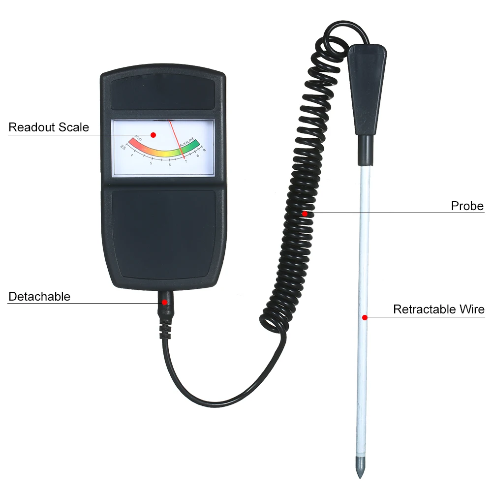 Удобный дизайн: один зонд, предназначенный для проверки значения pH почвы и уровня влаги, тестер и зонд разделяются, И они подключаются через телефонный шнур, который можно растянуть до 1 метра.