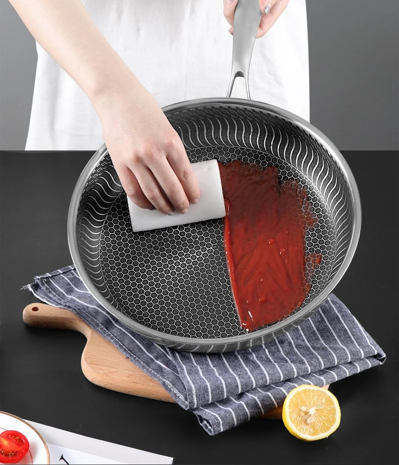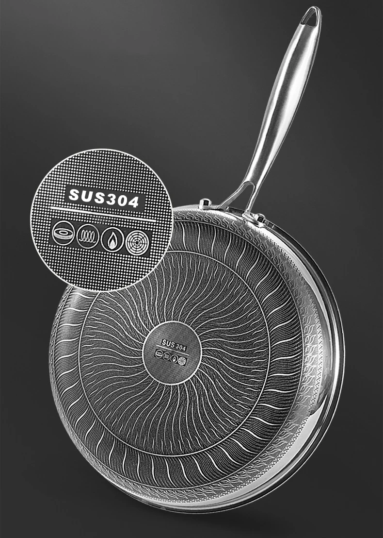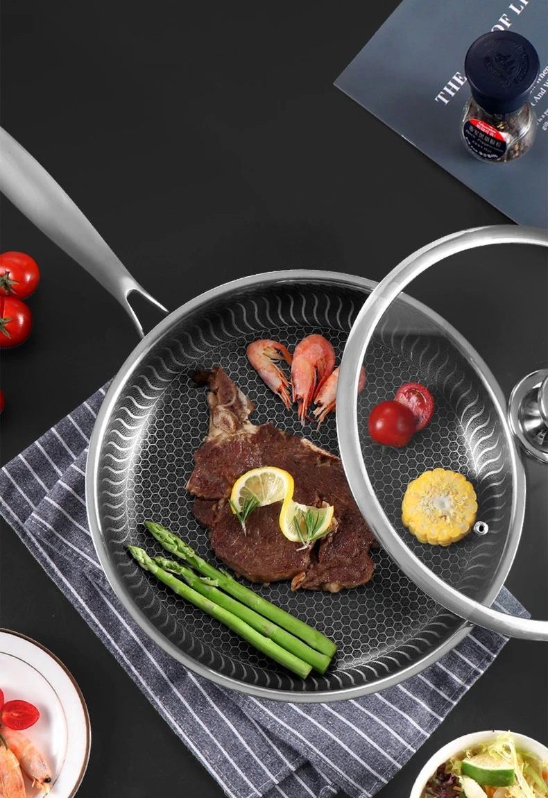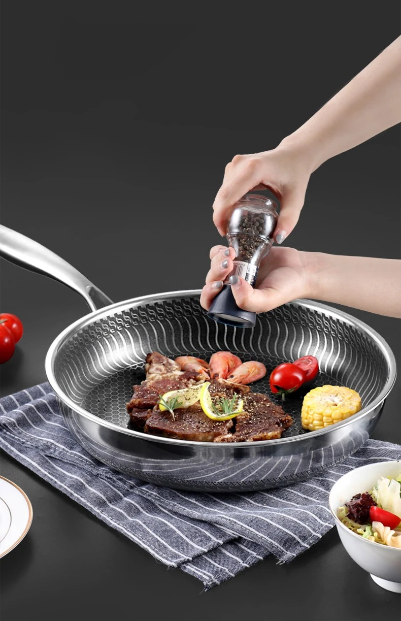 ● 11 дюймов Сковорода Из Нержавеющей Стали, антипригарная посуда внутренняя сотовая текстура, достичь разделения состояния антипригарная.