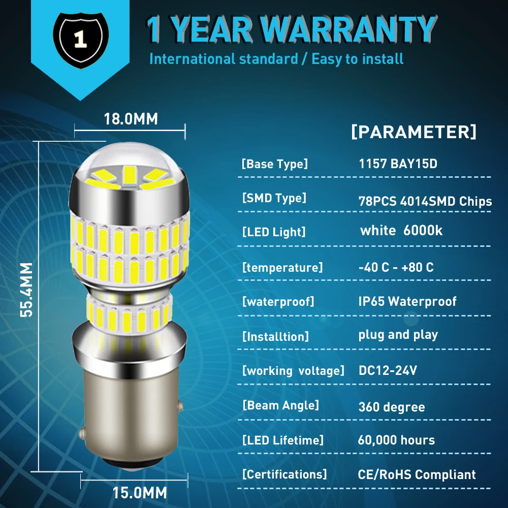 1. Подходит для дневных ходовых огней, указателей поворота, фонарей заднего хода, задних фонарей, стоп-сигналов и т. д. 2. Высокомощный светодиодный чип 4014 78 шт. обеспечивает идеальную форму луча, высокую светильник отдачу, низкое энергопотребление. 3. В Европе и новейших автомобилях, оснащенных системой CAN-BUS, если сигнал поворота и стоп светильник установлены неправильно, может потребоваться нагрузочный резистор, чтобы обойти код ошибки/мигание проблемы.