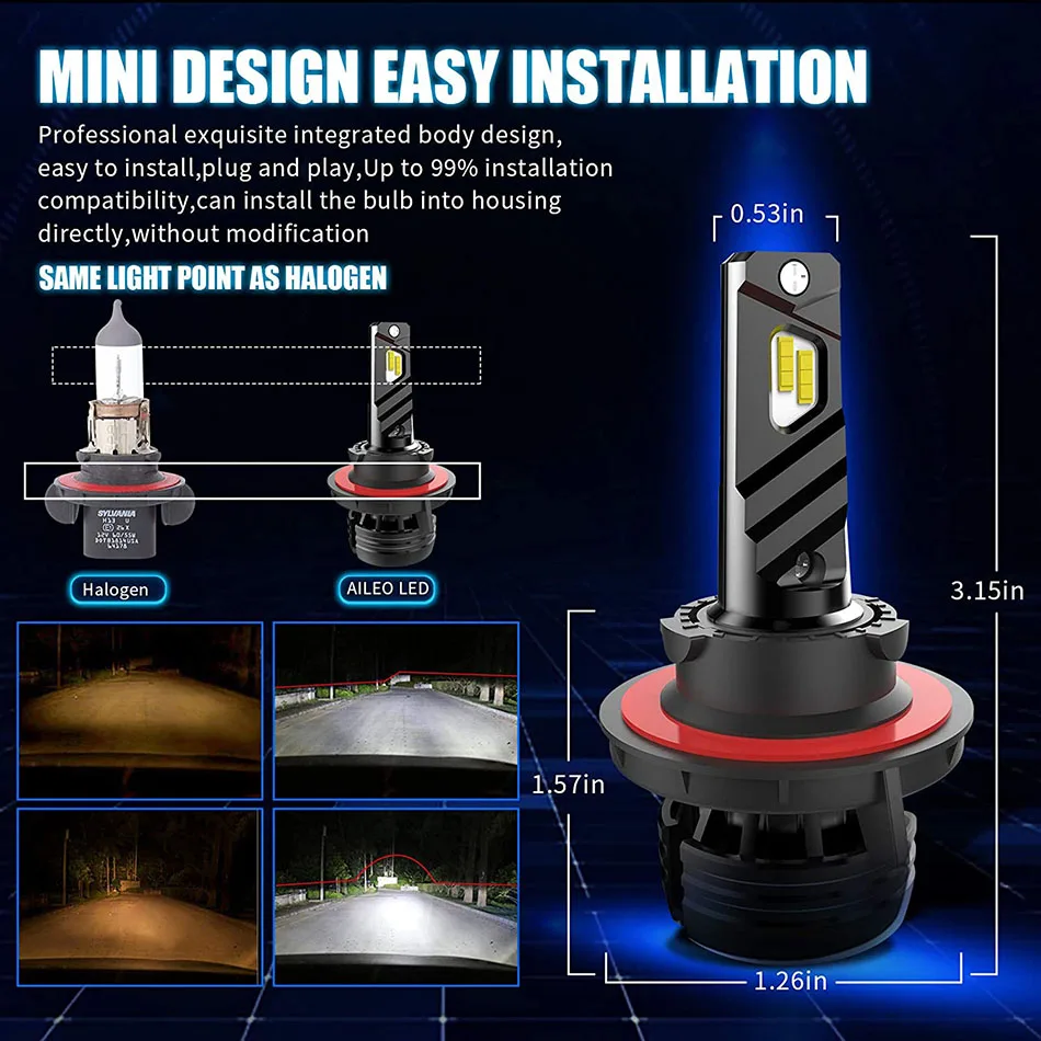 Модель: H13 9008 дальний/Ближний Входная мощность: 60 Вт/за пару, 30 Вт/за лампу Рабочее напряжение: 9-32 В постоянного тока (подходит для транспортных средств 12 В, 24 В) Световой поток: 12000 лм/на пару, 6000 лм/лампа Уровень IP: IP67 водонепроницаемый Установка: просто подключи и играй Светодиодный чип: AILEO, индивидуальный CSP чип высокой яркости (не обычный CSP) Цветовая температура: 6000 К белый Гарантия: 2 года