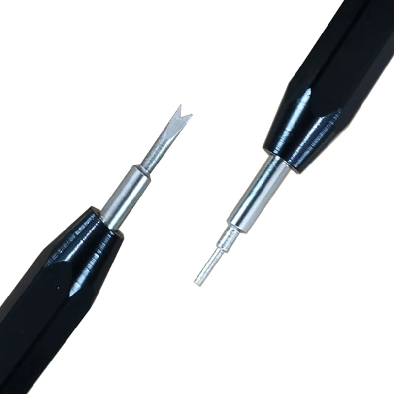 Один конец имеет плоский кончик с v-образной окантовкой, другой имеет раздвоенный кончик, который можно переключить на точечный кончик.