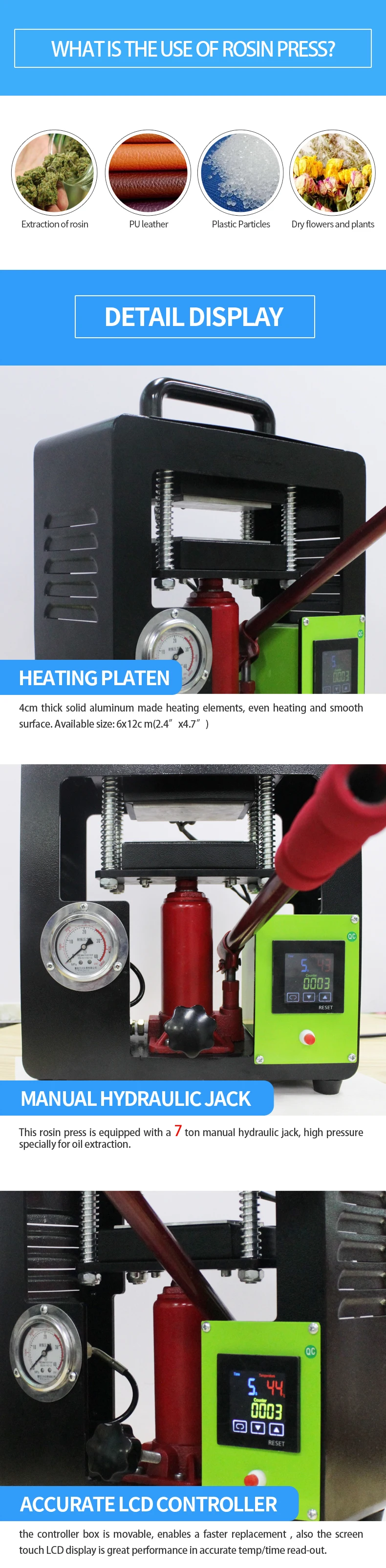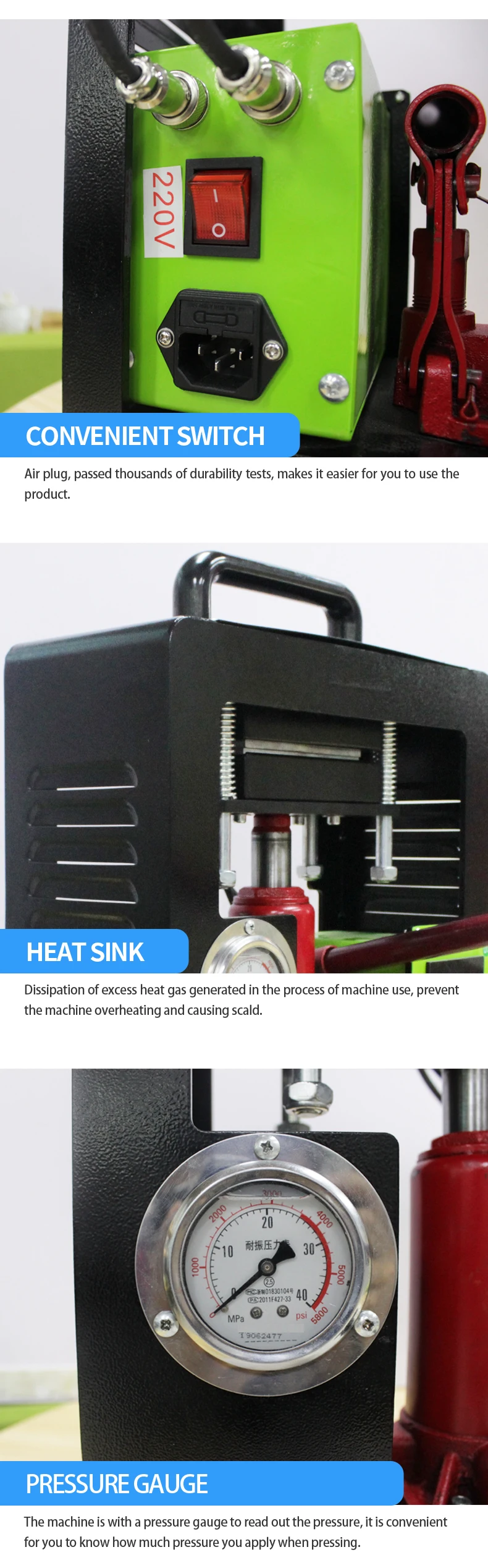 Мощность использования: 90 ~ 240 В Мощность: 600 Вт Диапазон температур: 0-250C Максимальное давление: 10 тонн Диапазон рабочего давления: 0 ~ 7 тонн Размер нагревательных пресс-пластин: 6x12 см/2,4*4,7" Размер изделия: 27*32*32 см N. Вес: 18 кг