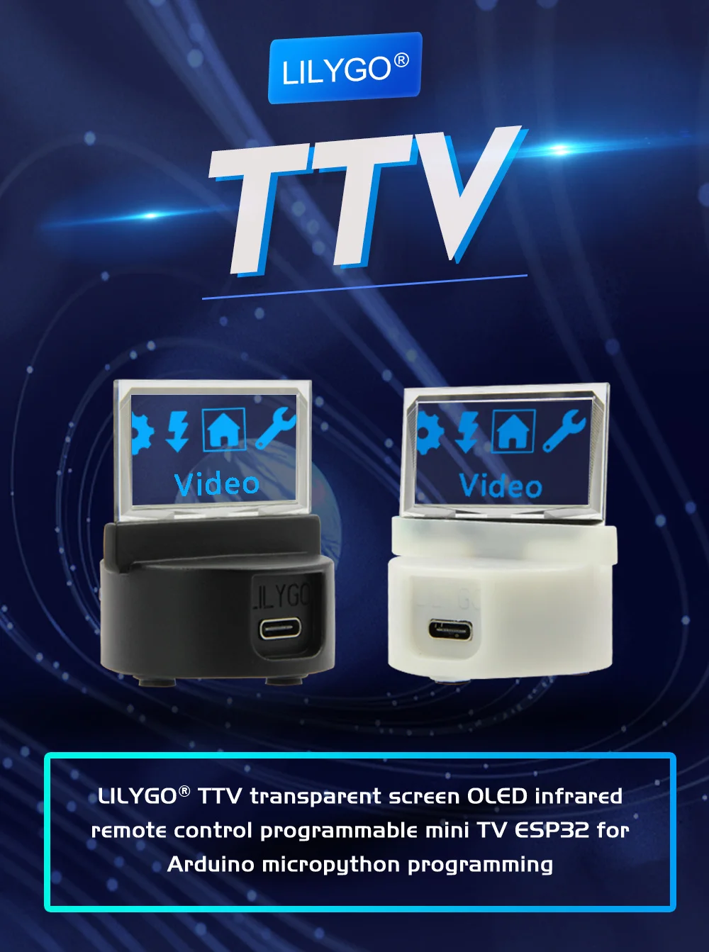 LILYGO TTV продолжает концепцию программируемых продуктов. Основываясь на прозрачный oled-экран дизайне, мы сделали программируемый Настольный прозрачный небольшой телевизор.