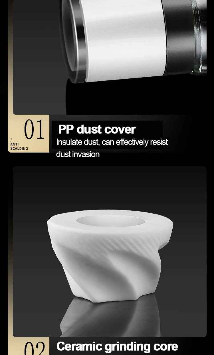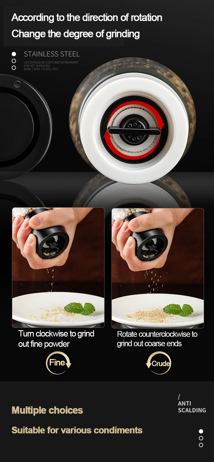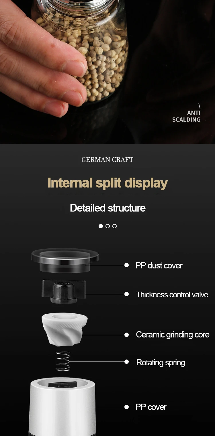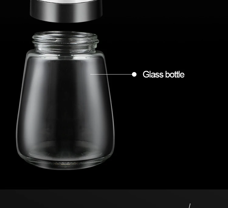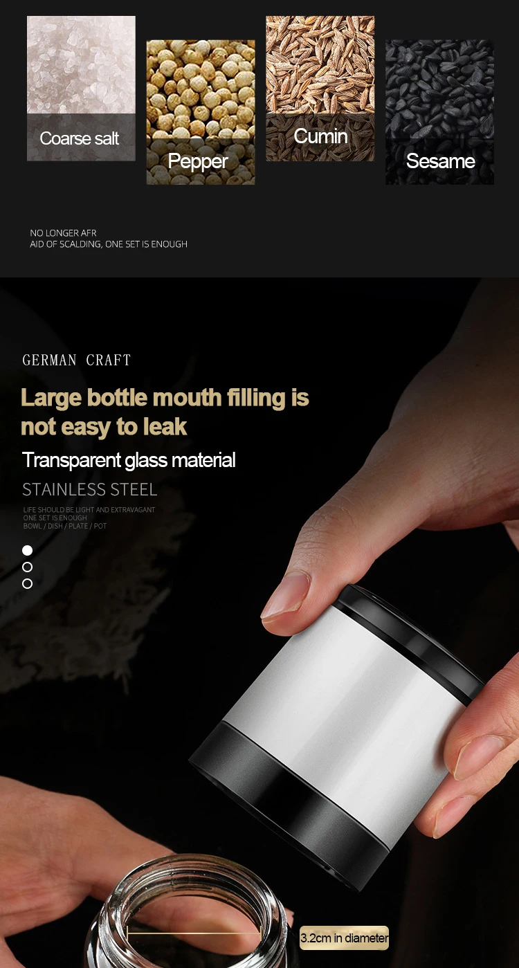 Пылезащитный чехол 1PP, изолирует пыль, может эффективно противостоять попаданию пыли Конструкция с 2 винтовыми крышками, вращение может регулировать плотность шлифования, толщина контролируется вами Корпус бутылки из 3 стеклянных материалов, гигиеничный и без запаха, безопасный, гигиеничный и удобный для хранения 4. Нескользящее основание, стабильное размещение, толстый материал, не подвергается ударам