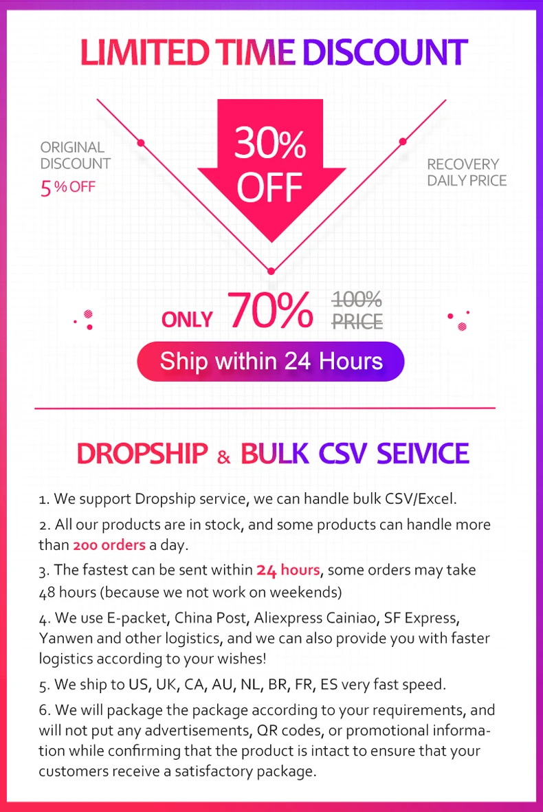 FAQ В: есть ли скидка на крупные заказы? О: если вы разместите у нас крупный заказ в течение определенного периода времени, мы отправим товар вместе и предоставим Вам скидку. В: Поддерживаете ли вы другие варианты доставки? О: Да, мы предоставляем Почта Китая обычных малых пакетов Plus, Cainiao Super Economy, ePacket, стандартную доставку AliExpress и заказную авиапочту Почта Китая В: все ли фотографии настоящие? О: Конечно, все наши фотографии на 100% сделаны нашими фотографами В: Поддерживаете ли вы прямые поставки? О: Да, мы поддерживаем прямую доставку. Вам нужно только подтвердить информацию В: почему доставка такая медленная? О: на самом деле, это не так быстро, как DHL fedex, потому что все наши продукты имеют низкую маржу и бесплатную доставку для большинства стран, что является потерей для некоторых стран, если честно, но я считаю, что логистика не медленная и может отслеживать, куда идет информация. Отгрузка 1. После оплаты, из-за ситуации с запасами и разницы во времени, мы выберем отправку ваших товаров с нашего первого доступного склада для быстрой доставки, мы тщательно подготовим товар для вас в течение 1-5 дней. Обычно время доставки составляет 5-60 дней и даже больше для судов из отдаленных или слаборазвитых стран. 2. Мы осуществляем доставку только по подтвержденному адресу заказа. Ваш адрес заказа должен совпадать с адресом доставки. 3. Время доставки услуги должно быть предоставлено перевозчиком, за исключением выходных и праздничных дней. Время доставки может варьироваться, особенно во время праздников. 4. Информация об отслеживании будет предоставлена в течение 2-5 дней после отправки (информация об отслеживании в некоторых случаях не предоставляется бесплатно). Если вы все еще не получили товар, когда срок доставки подходит к концу, пожалуйста, свяжитесь с нами, чтобы продлить для Вас дату доставки. 5. Если вы не получили товар в течение 60 дней после оплаты, пожалуйста, свяжитесь с нами. Мы Отследим доставку и свяжемся с вами в кратчайшие сроки. Наша цель – удовлетворение клиентов! Возмещение 1. При получении товара, если вы обнаружили какую-либо проблему с товаром, пожалуйста, немедленно свяжитесь с нами и предоставьте нам достаточные доказательства. (Совет: при открытии посылка запишите незапечатанное видео.) Если товар Действительно поврежден, сделайте фото и отправьте его на нашу электронную почту или онлайн-чат, чтобы связаться с нами. Мы предоставим Вам решения или компенсацию. 2. У вас есть 7 дней, чтобы связаться с нами и вернуть товар через 15 дней после получения. Если у вас есть товар более 7 дней, вы рассмотрите возможность его использования, и мы не вернем Вам деньги или заменим его. 3. Все возвращаемые товары должны быть в оригинапосылка вке, и вы должны предоставить нам номер отслеживания доставки, конкретную причину возврата и идентификатор вашего заказа. 4. После получения первоначального состояния и упаковки возвращаемого товара со всеми компонентами и аксессуарами, мы вернем вам полную сумму покупки. 5. Если товар прибудет к вам, а вы его не заберете, он будет возвращен нам. После получения товара, мы вернем или повторно отправим его вам по запросу (вы будете нести ответственность за возврат и почтовый сбор). Отзывы Отзывы 1. Если вы довольны нашими товарами, Мы будем признательны за ваш отзыв в пять звезд. Мы поставим вам такой же отзыв с 5