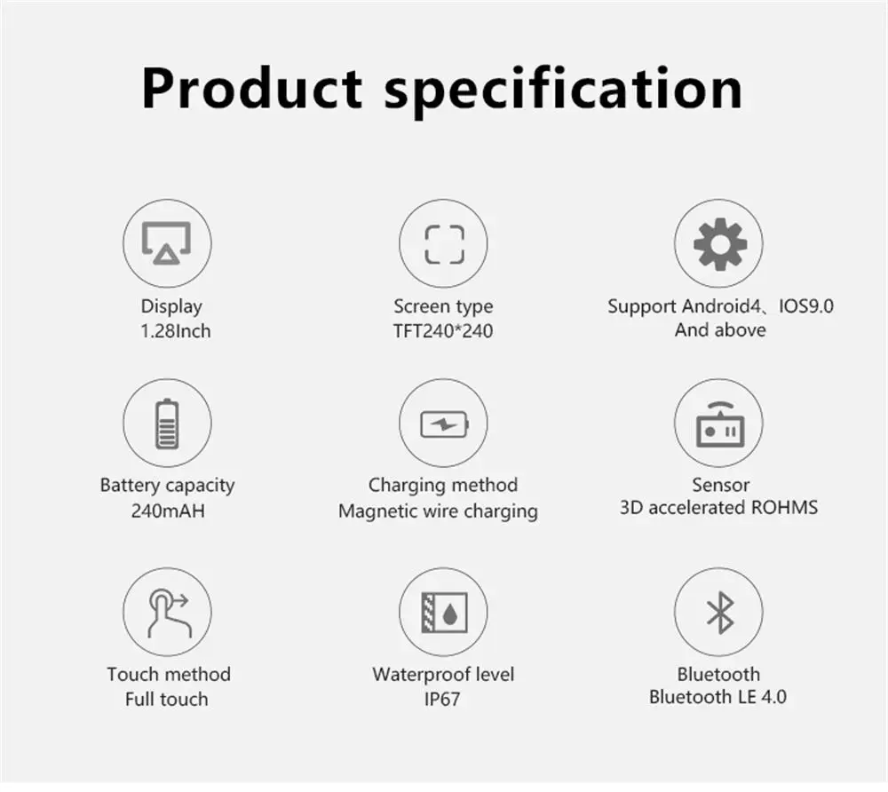 * Вызов по Bluetooth: прием/отклонение звонков, с циферблатом, хранение 1000 контактов, Последние записи звонков. * Музыкальный плеер: воспроизведение музыки в телефоне/воспроизведение музыки в локальной системе/подключение bluetooth-наушников/динамик для воспроизведения музыки * Напоминания об информации: QQ, WeChat, информация, отображение другого содержимого приложения, отображение номера вызова. Отображение 24 байт * Спортивные режимы: шагомер, пробег, расход калорий, движение (отображается в приложении) * Монитор здоровья: мониторинг сна, напоминание о сидячем положении, напоминание о питьевой воде, мониторинг сердечного ритма, кровяное давление, мониторинг кислорода в крови * Другие функции: будильник, удаленное фотографирование, управление музыкой, напоминание о сидячем положении, напоминание о воде, отображение погоды и т. д. * Время работы в режиме ожидания: 168 ч Время работы в режиме ожидания; 4 часа непрерывной музыки/телефонных звонков; Ежедневное использование аккумулятора: 36 часов