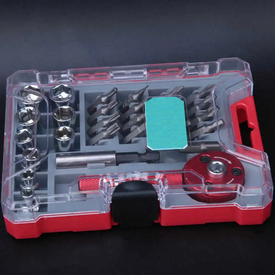 Ведущая головка отвертки имеет встроенное храповое устройство, что удобно и экономно. Нескользящая рифленая алюминиевая ручка обеспечивает удобное удержание и лучший контроль. Розетки и сверла изготовлены из стали, высокой твердости, износостойкости и нержавеющего. Удлинительный стержень позволяет отвертке быть внутри машины для ремонта. Этот комплект поставляется с различными размерами розеток и бит для удовлетворения ваших потребностей. Все инструменты хранятся в прозрачной пластиковой коробке, чтобы аккуратно организовать и легко переносить.