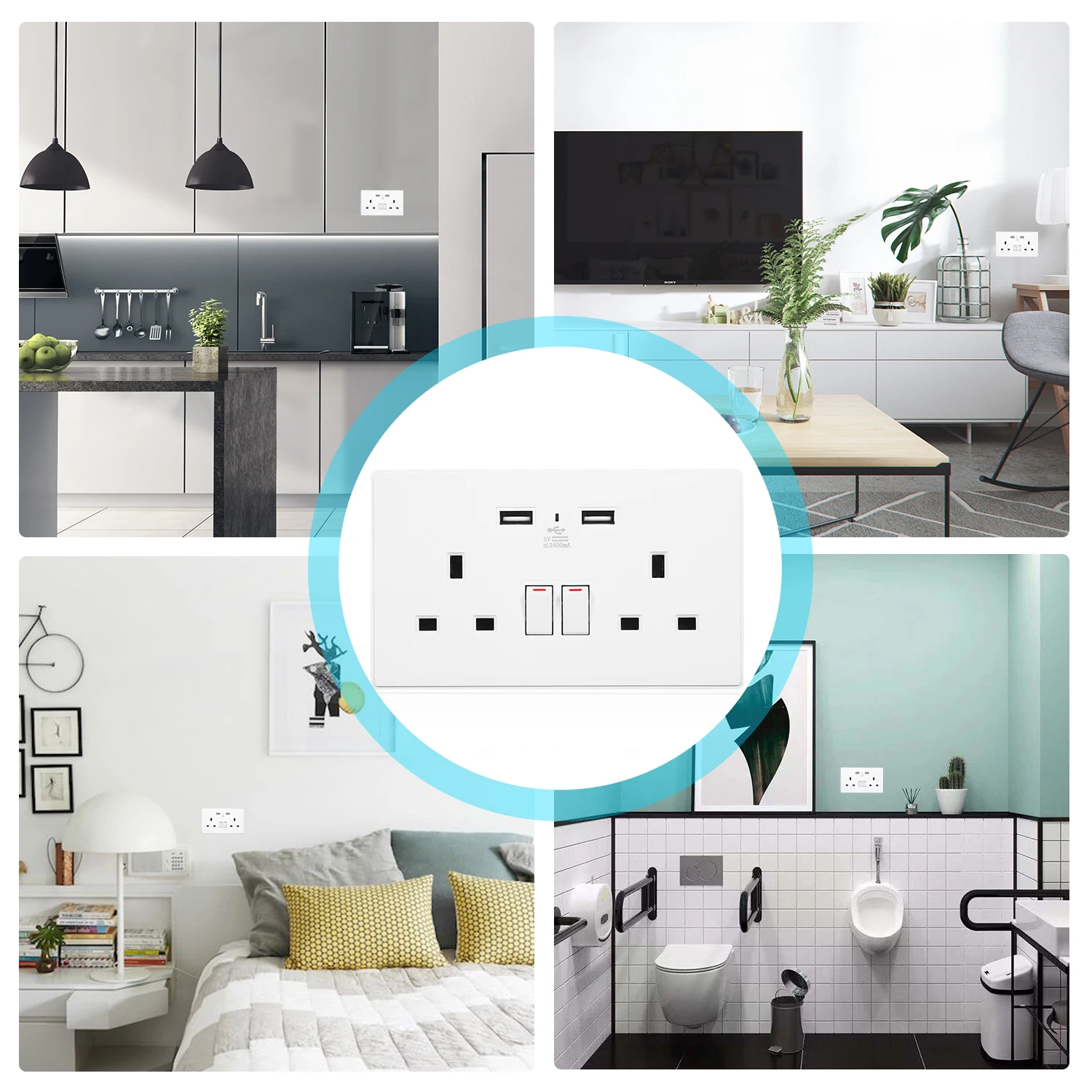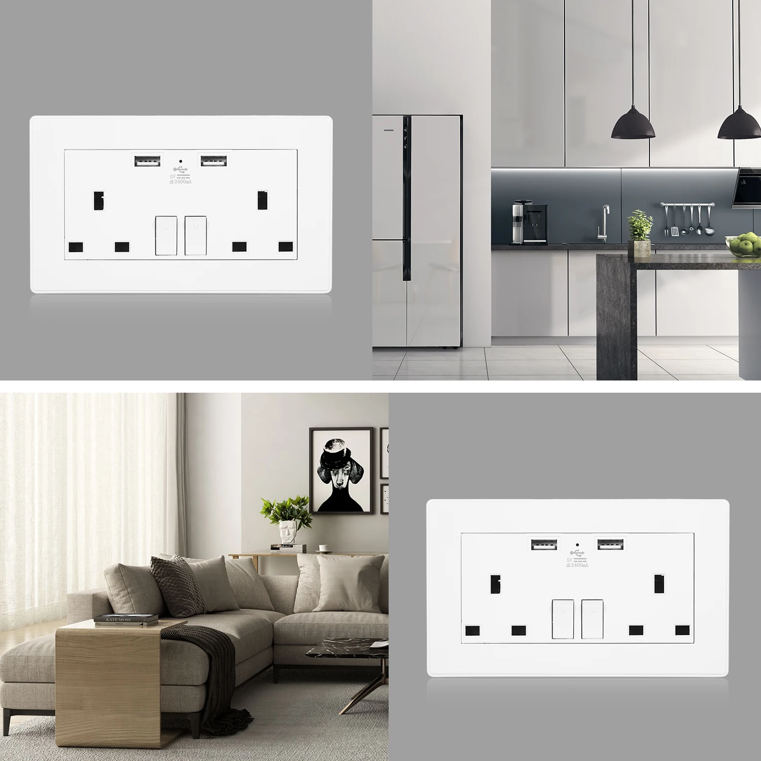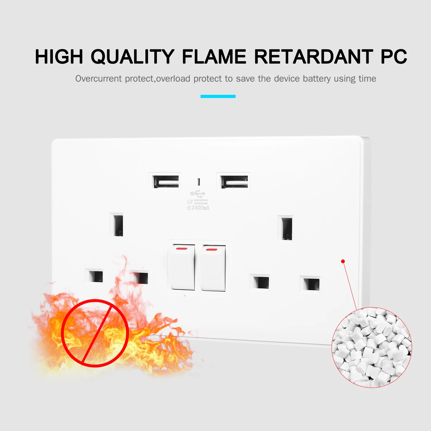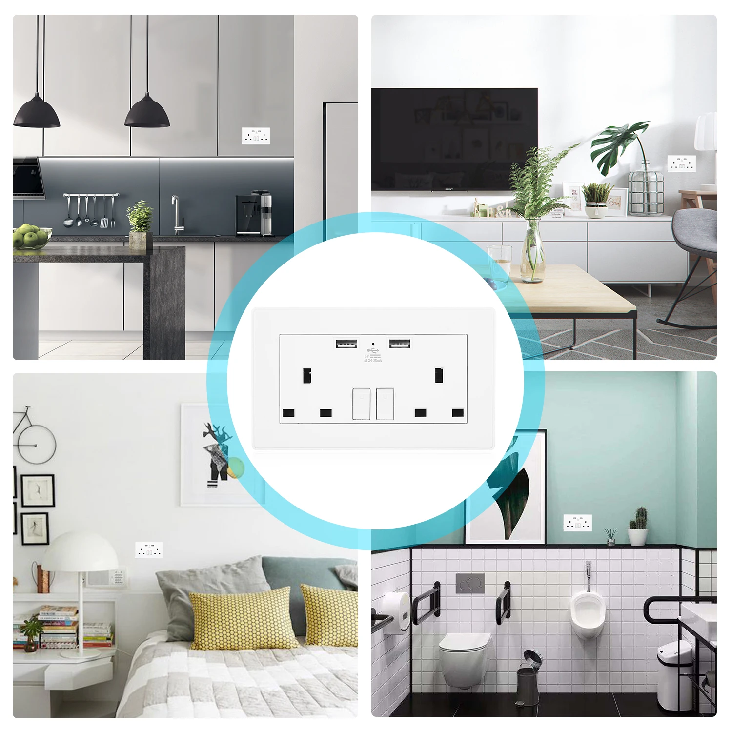Эффективное сочетание:Небольшая Квадратная настенная розетка имеет 2 гнезда стандарта Великобритании, 2 порта USB и 2 переключателя, зарядка одновременно, чтобы сэкономить ваше ценное время.