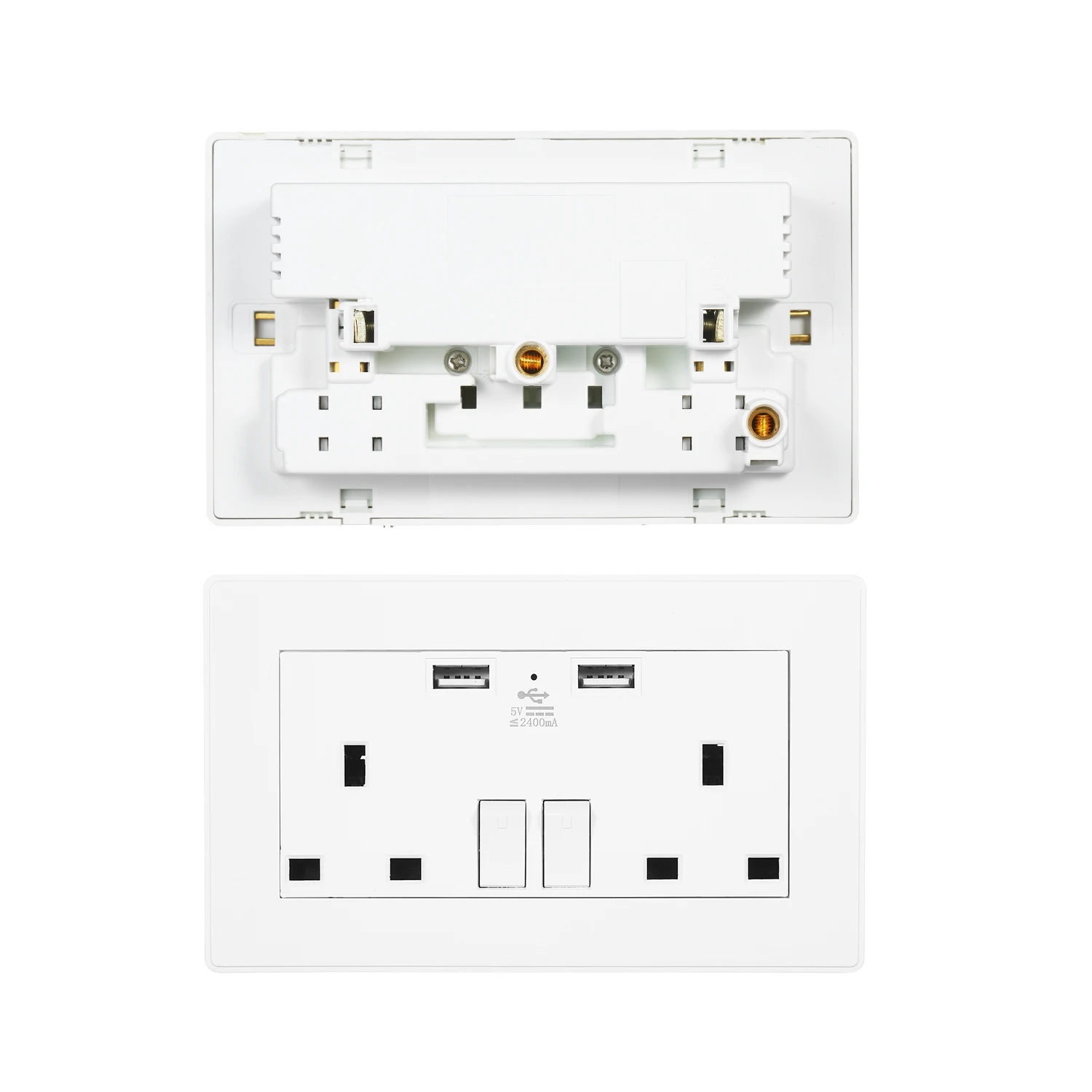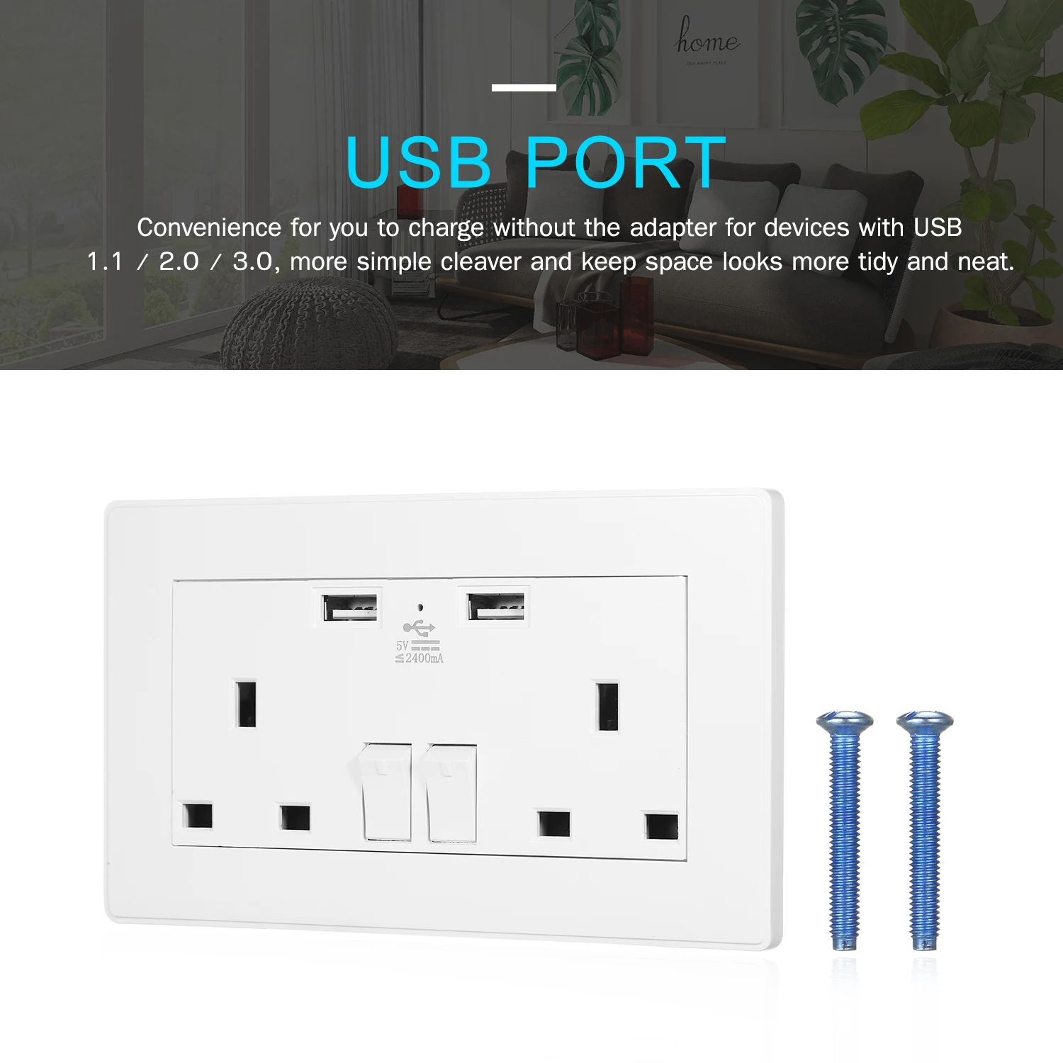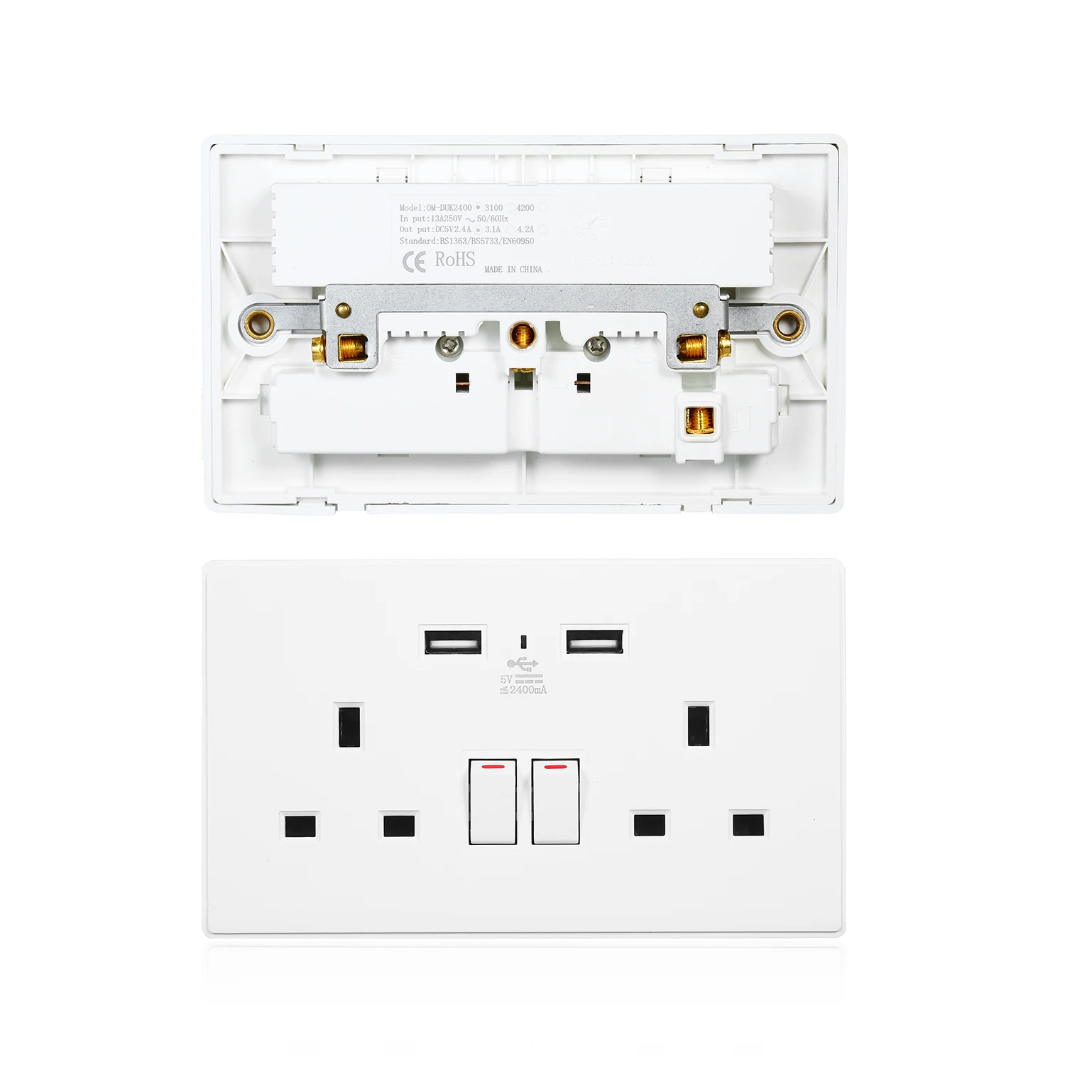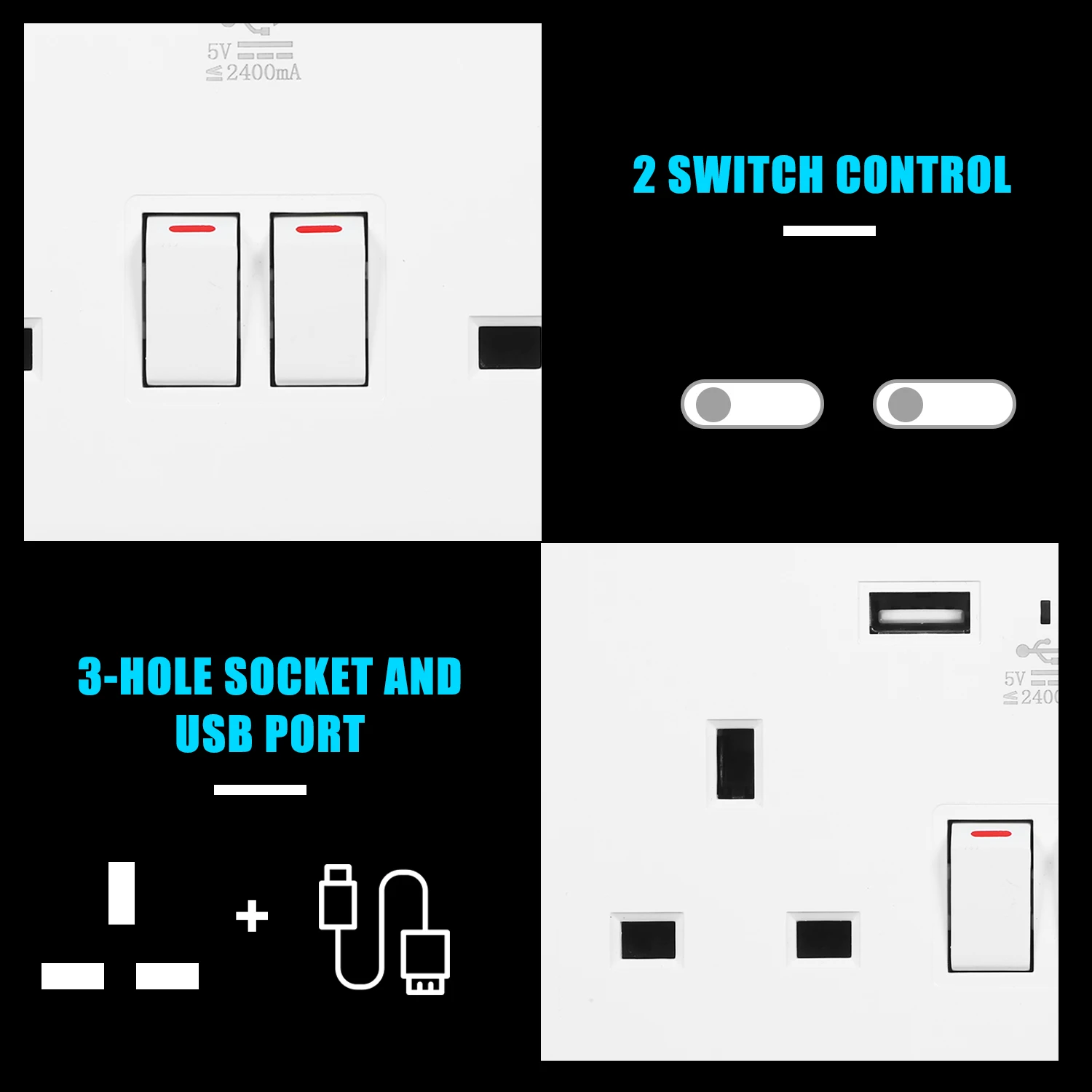 Эффективное сочетание:Небольшая Квадратная настенная розетка имеет 2 гнезда стандарта Великобритании, 2 порта USB и 2 переключателя, зарядка одновременно, чтобы сэкономить ваше ценное время.