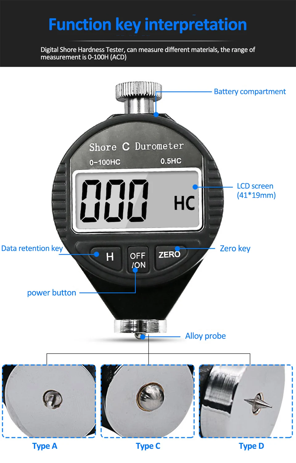 Различные твердости тестеры могут быть выбраны в соответствии с твердостью материала, 0-100HA (более твердый)>A (твердый)>C (мягкий)