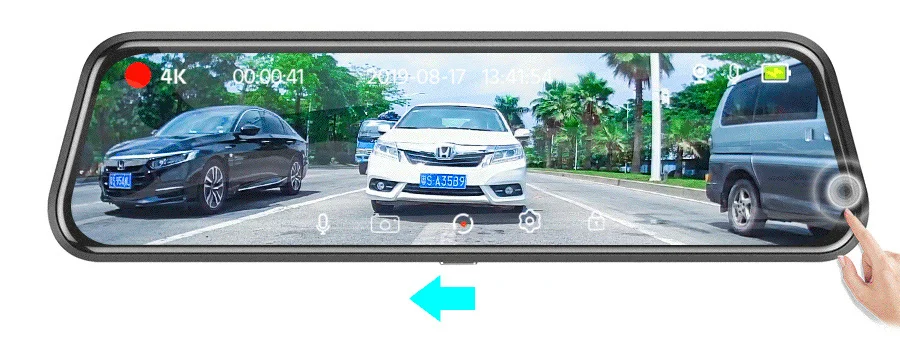 1:1 дизайн разделенного экрана для переключения записи спереди и заднего вида, большой экран и четко и ersily для проверки заднего вида. Вы можете переключаться, проводя пальцем влево или вправо. Он содержит 3 вида: вид спереди, вид сзади, вид спереди и сзади.