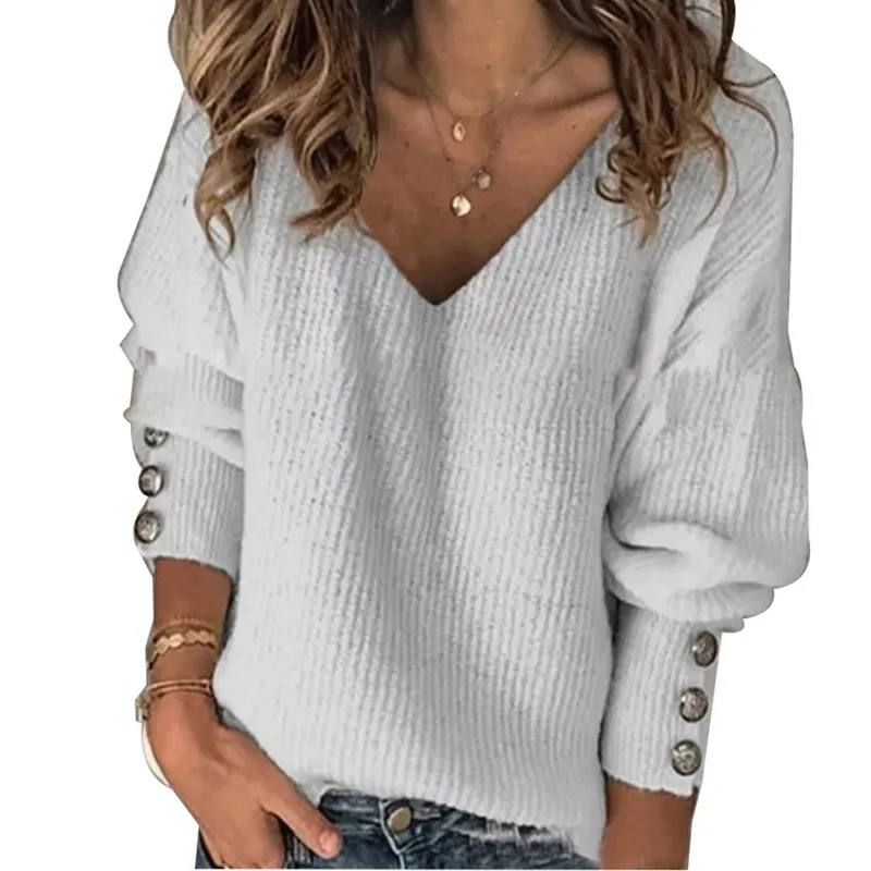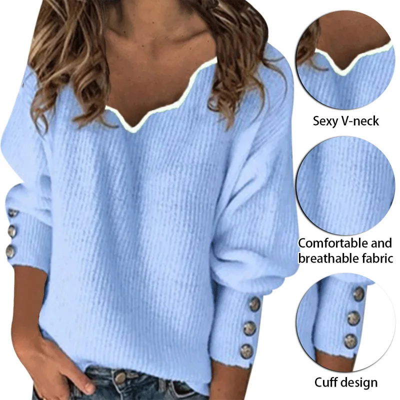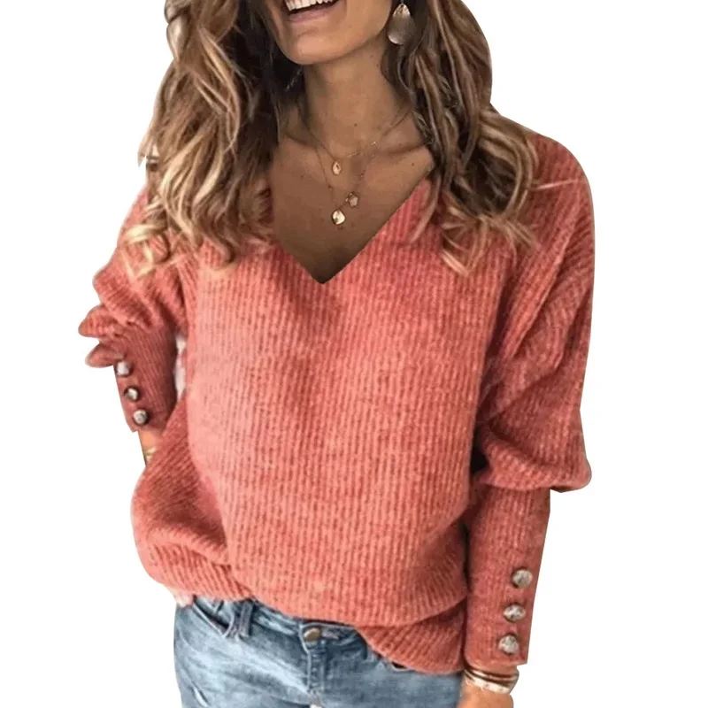 Особенности: женский Однотонный свитер с V-образным вырезом, вязаный свитер, свободный свитер с длинным рукавом, декоративный свитер на пуговицах