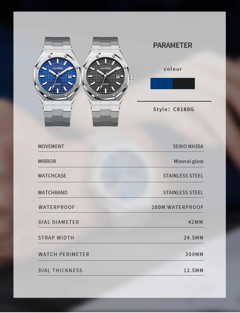 -100% Новинка и высокое качество. -Точные автоматические механические часы. Для точного учета времени. -Японский NH36A полностью автоматический механический механизм. -Чехол из нержавеющей стали 316L и ремешок для часов из нержавеющей стали -Водонепроницаемость на глубине 100 м. (Примечание: Из-за ручного измерения погрешность в размерах составляет 1-2 мм)