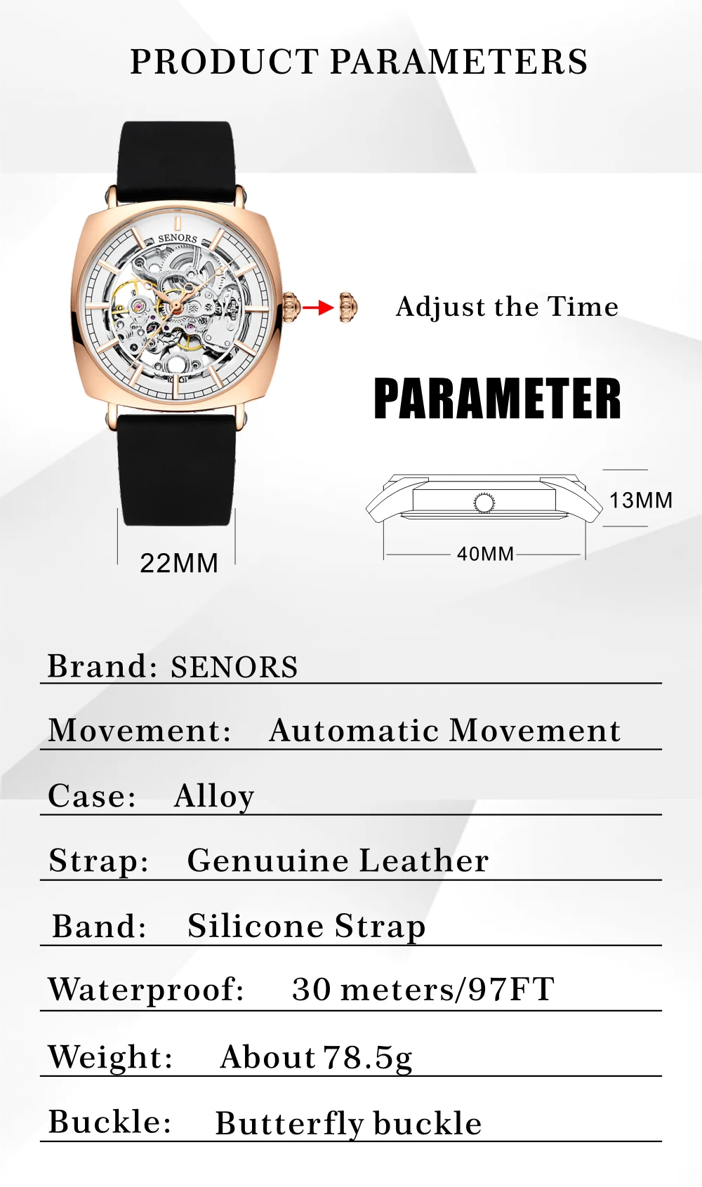 SN212 Чехол: Высококачественный цинковый сплав Стекло: минеральное Хрустальное стекло Механизм: автоматический механический механизм Ремешок: силиконовый ремешок Водонепроницаемость: 3 АТМ Пластина: IP-пластина Чехол Диаметр: 40*40 мм Ширина ремешка: 22 мм Чехол Толщина: 13,5 мм Длина ремешка: 260 мм, включая чехол Вес часов: 78,5 г