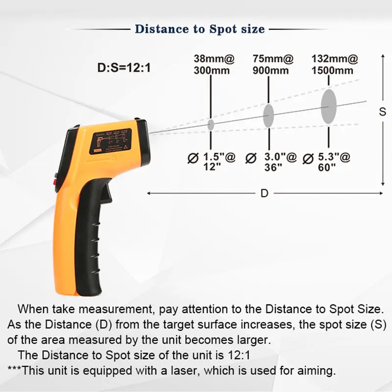 <Диапазон измерений: термометр измеряет температуру поверхности от-50 до 600 ℃ (-58-1112 ℉) вы можете выбрать единицу измерения от ℉/ ℃.