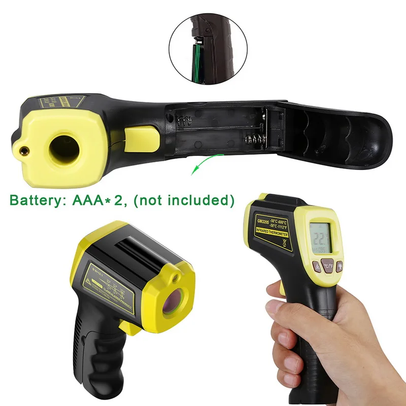 <Бесконтактный: нет прямого контакта с объектами, которые находятся в опасной горячей или холодной воде. Вы просто наведете термометр на нужную поверхность, нажимаете на триггер и мгновенно получаете показания температуры, это так удобно и безопасно.
