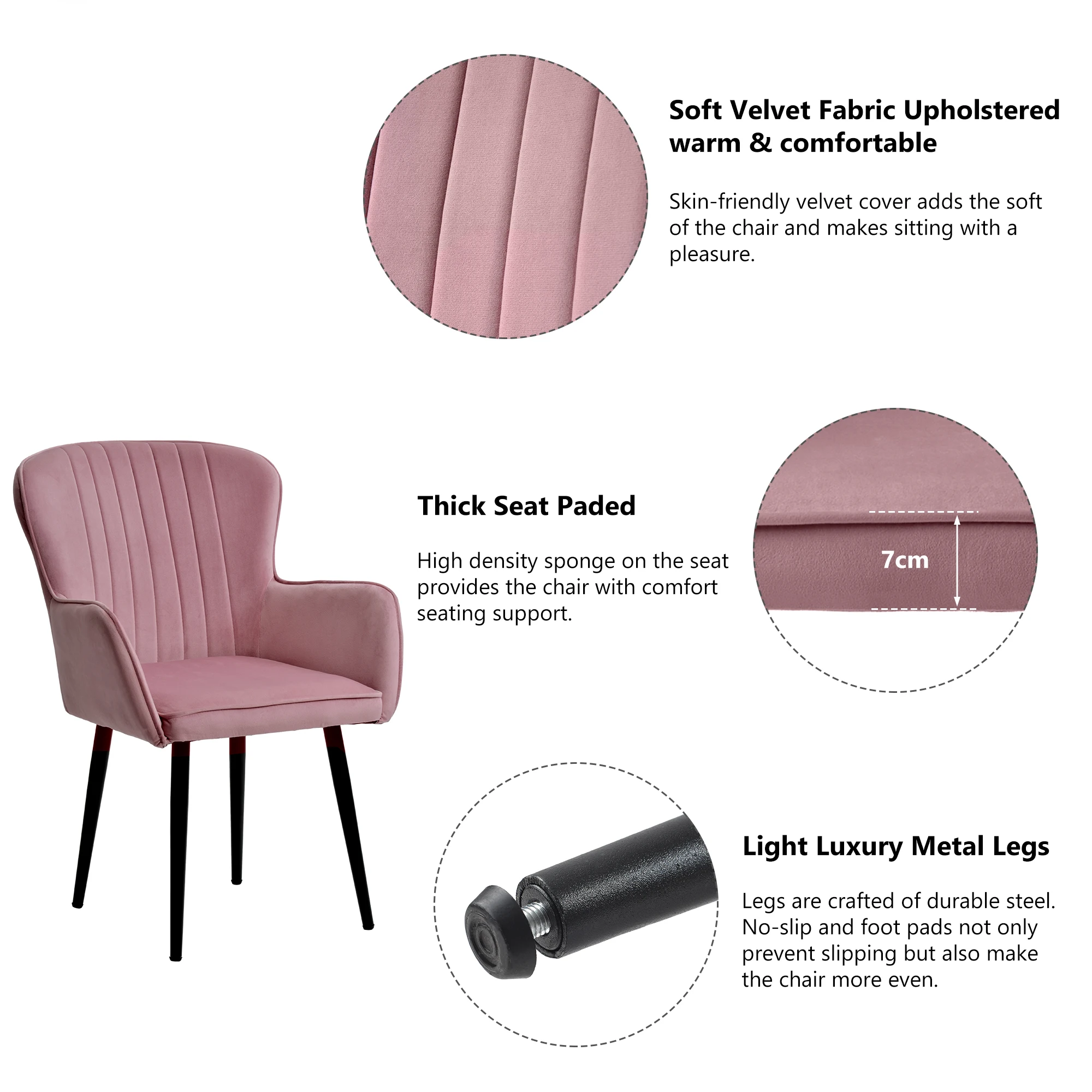 [Приятный на ощупь мягкий материал] Бархатная обивка имеет мягкую тонкую текстуру, которая лучше сохраняет тепло. Каждое кресло имеет подушку сиденья из губки высокой плотности, отвечающую стандарту Великобритании огнестойкость, и тонкие металлические ножки с полированным черным покрытием с грузоподъемностью 250 фунтов. [Практичный и эргономичный дизайн] благодаря простой обтекаемой конструкции корпус стула плавно переходит в наклонные подлокотники с акцентами на тканевых трубах, акцентирующими изгиб стула для создания изысканного образа. Благодаря тонким ножкам стула, выполненным из металла с порошковым покрытием и защитным ножкам, предотвращающим появление царапин на полу, наслаждайтесь оптимальной поддержкой и стабильностью звука, сидя на поролоновом сидении высокой плотности. Эргономичный стул, предназначенный для комфорта, долговечности и безупречного стиля. [Роскошная вдохновленная поддержка] испытайте 360 поддержку благодаря хорошо структурированной конструкции, разработанной для поддержки контуров вашего тела, расслабляясь, не выдавая привлекательности, которая мгновенно поднимет ваше пространство. [Простая сборка] четыре базовые ножки снимаются и регулируются, что позволяет легко регулировать ваши ощущения при сидении. Изготовлен для простой сборки, идеально подходит для тех, кому нужно немного больше времени на руках. Инструкция по эксплуатации и инструменты для сборки входят в комплект. Можно установить в течение 5 минут. [Современные многофункциональные стулья] этот стул высотой можно разместить в столовой или гостиной, чтобы добавить современный ретро-вид интерьера вашего дома. Размеры изделия: 59 × 42 × 87 см (Д × Ш × В), высота сиденья: 39 см, ширина сиденья: 46 см, глубина сиденья: 44 см, толщина сиденья: 7,5 см, высота спинки: 48 см. Эти стулья идеально подходят для вашего ресторана, гостиной, кофейни, патио, спальни или для любого другого декора.