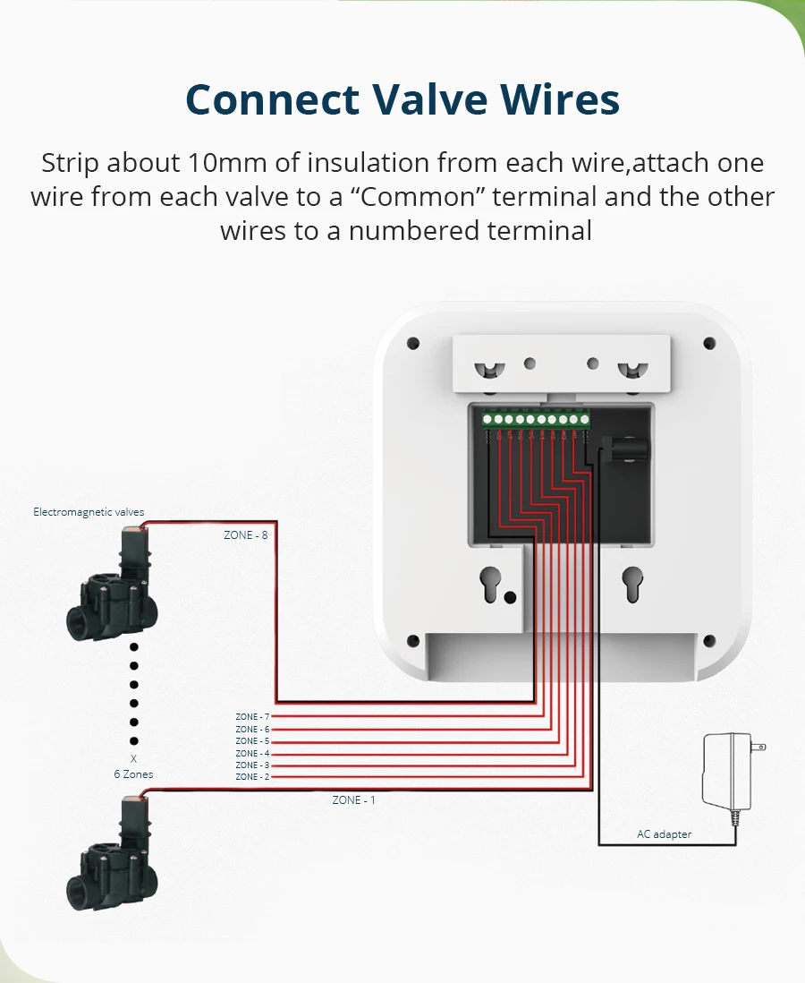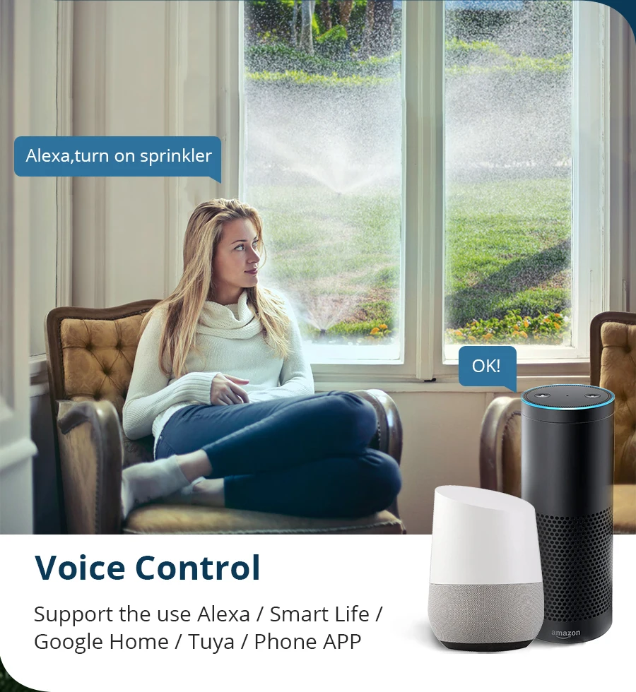 -Умный WiFi спринклер контроллер: он охватывает 8 зон 8 клапанов управления с приложением Tuya/Smart Life. Это позволяет управлять каждой отдельной зоной отдельно или всеми зонами вместе. -Умный полив: Поддержка таймера, обратного отсчета, контроль в реальном времени. Вы можете установить несколько периодов времени на воду, даже если вы забудете воду. -Ручное управление. Если Wi-Fi выключен, вы также можете напрямую управлять им вручную с помощью кнопок с сенсорным управлением, чтобы сделать жизнь более удобной. -Управление приложениями: подключиться к Wi-Fi (2,4 ГГц) и загрузите Tuya/приложение Smart Life, чтобы управлять вашим дождевальная установка на смартфоне, планшета, компьютера или ноутбука. Где бы вы ни находились, дома, на работе или в отпуске. -Голосовое управление: работа с Alexa и Google Home Assistant, ручное управление поливом вашего сада с вашим голосом. Он охватывает 8 зон 8 клапанов для обработки широкого спектра садов. -Link прогноз погоды: полив приостановлен в дождливые дни, солнечный тайм полива, сохранить вашу воду на открытом воздухе с передовыми водосберегающими технологиями, включая ежедневные корректировки погоды и историческую статистику -Широкое применение: умный Спринклерный контроллер может использоваться в домашнем саду, во дворе, на общественных лужайках, на фермах, в теплицах и т. д. -Простая установка. Закрепите кронштейн в стене с помощью прилагаемых винтовых якорей, а затем Повесьте контроллер на кронштейн.