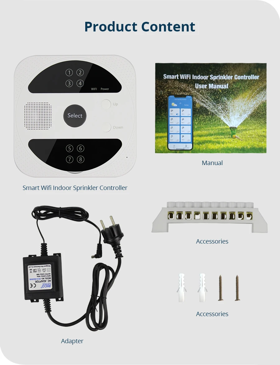 1 * умный Спринклерный контроллер. 1 * Адаптер переменного тока 1 * Руководство пользователя 1 * несколько аксессуаров