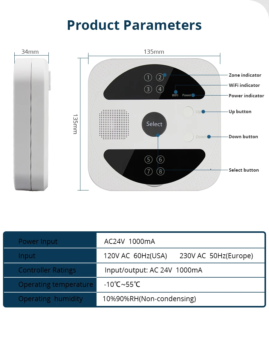 -Материал: пластик ABS. -Размер: 135x135x34мм. -Цвет: как на фотографии. -WI-FI: 2,4 ГГц. -Вход питания: AC24V 1000mA -Вход: 20 В переменного тока 60 Гц (вилка стандарта США) 230 В переменного тока 50 Гц (штепсельная Вилка европейского стандарта) -Рейтинг контроллера: вход/выход: 24 В переменного тока 1000мА -Рабочая температура: -10 ℃-55 ℃ -Рабочая влажность: 10% ~ 90% относительной влажности (без конденсации)