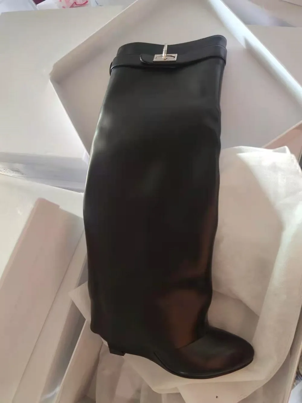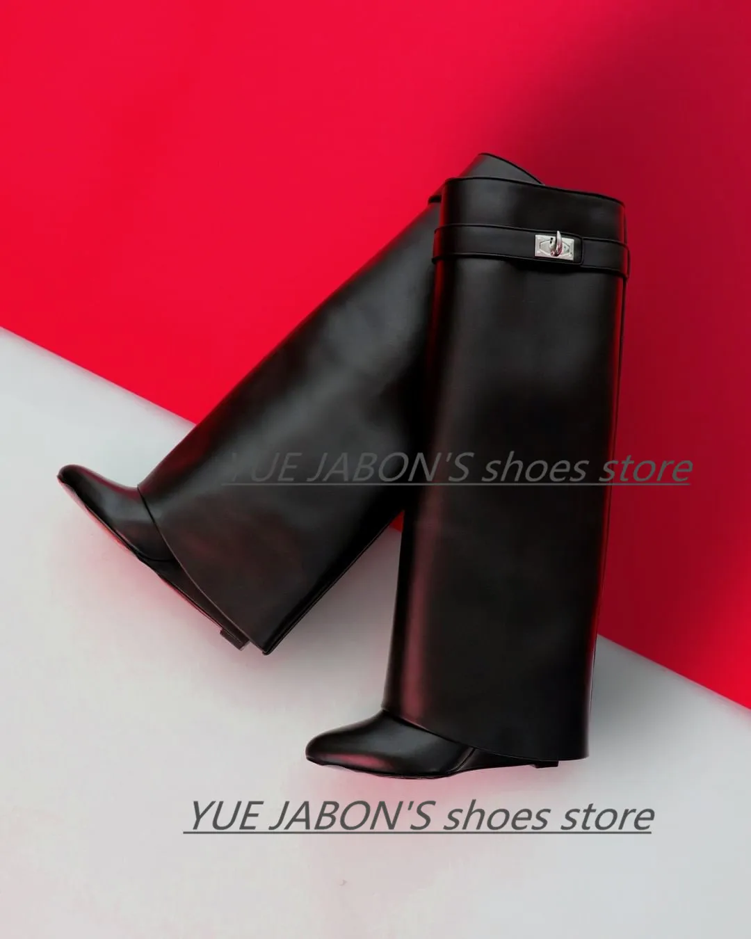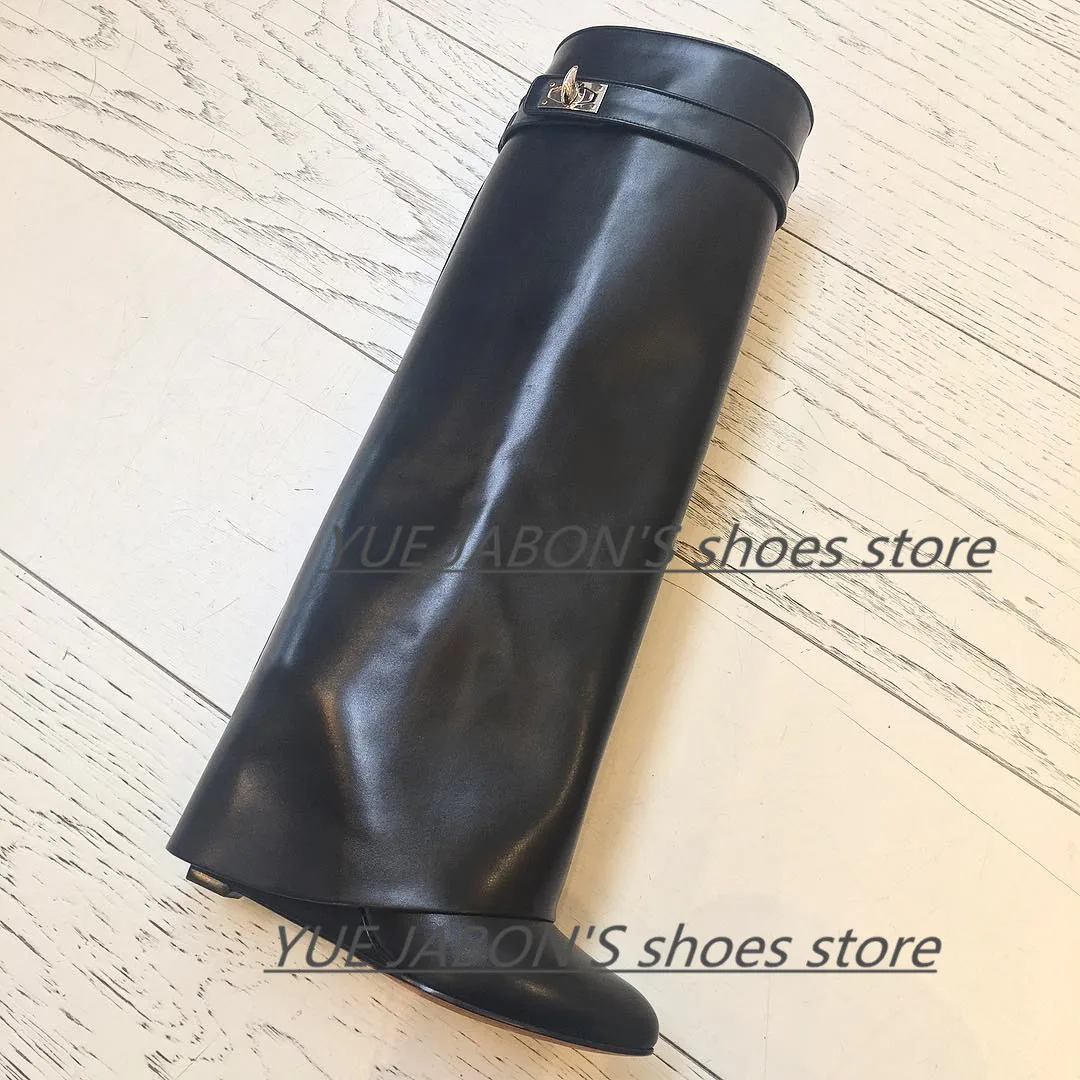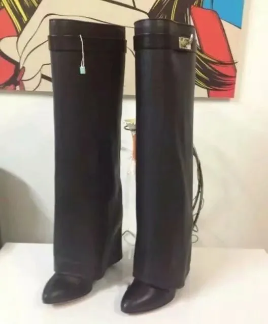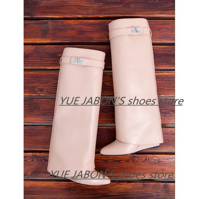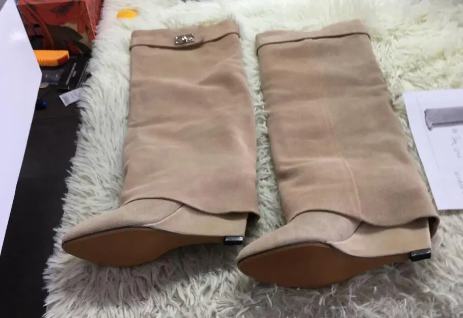 Серебристые сапоги до колена с металлическим замком «Акула»; Белые женские кожаные сапоги на танкетке с острым носком; Обувь на высоком каблуке; Сапоги выше колена