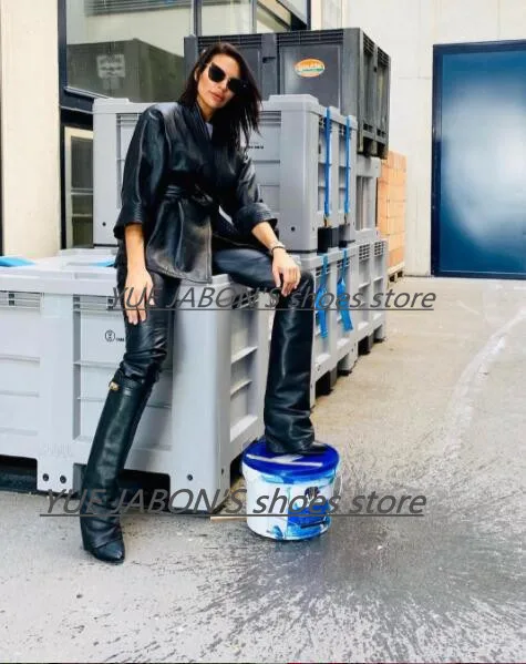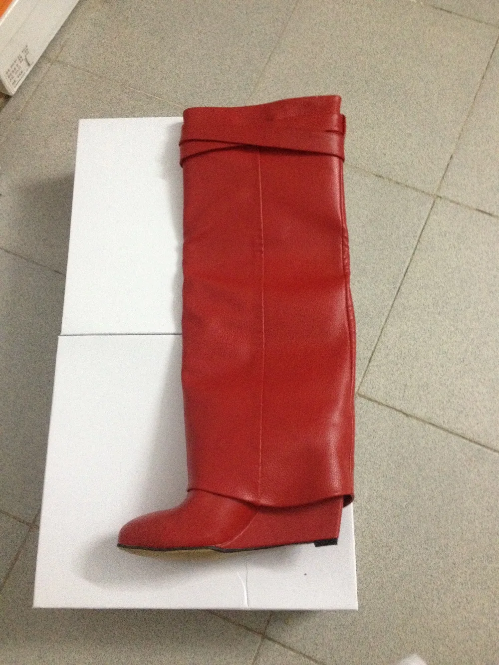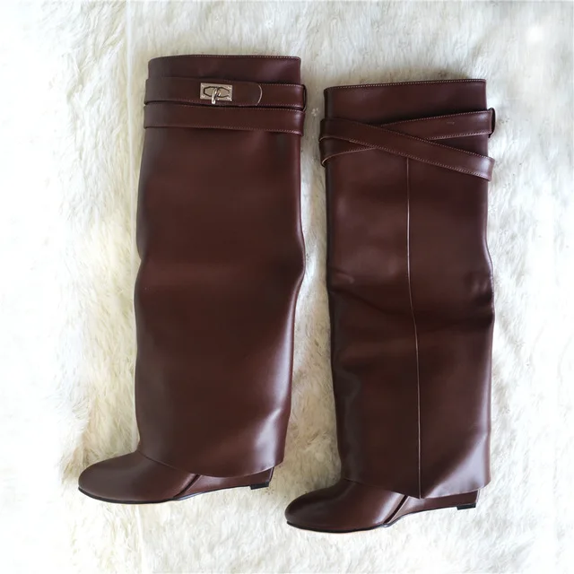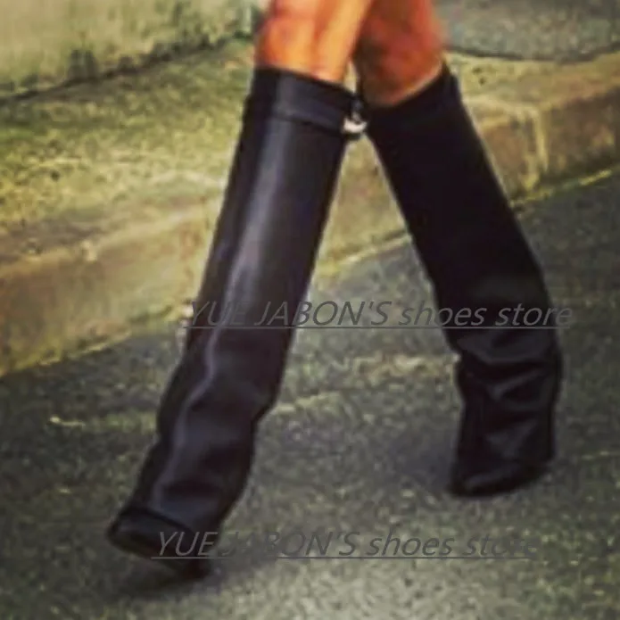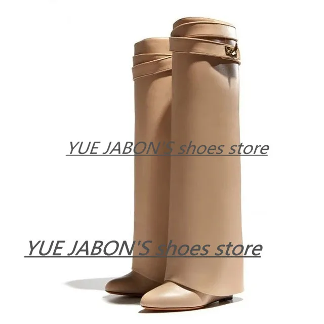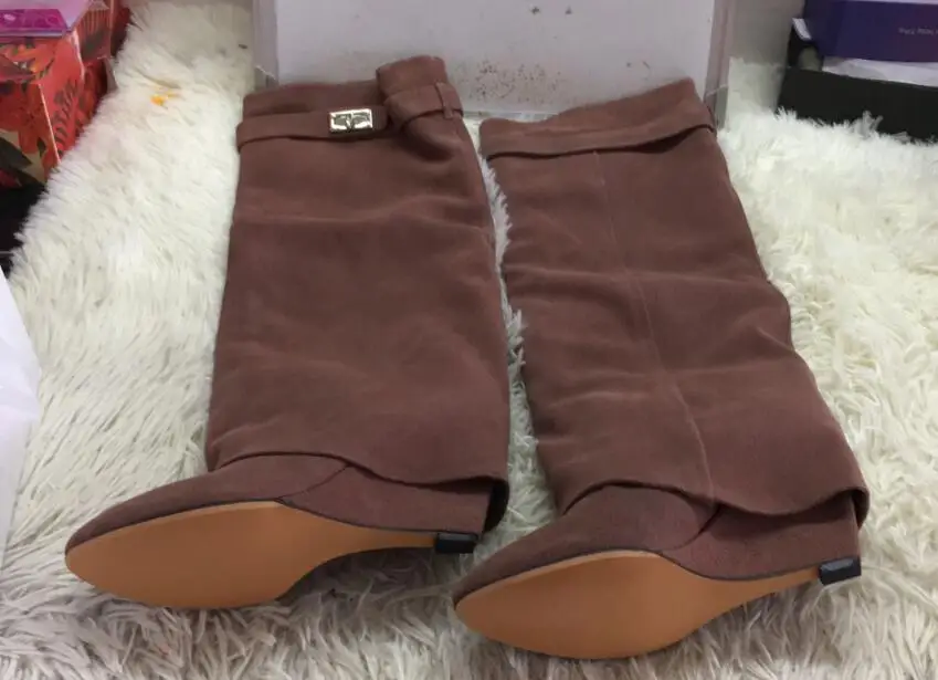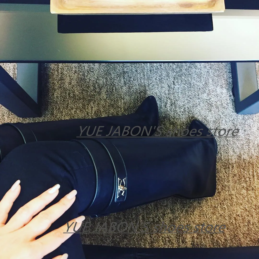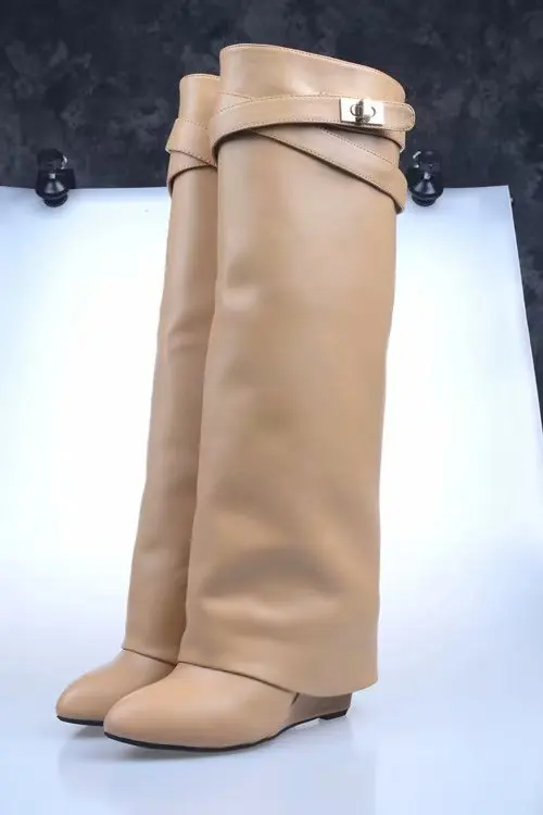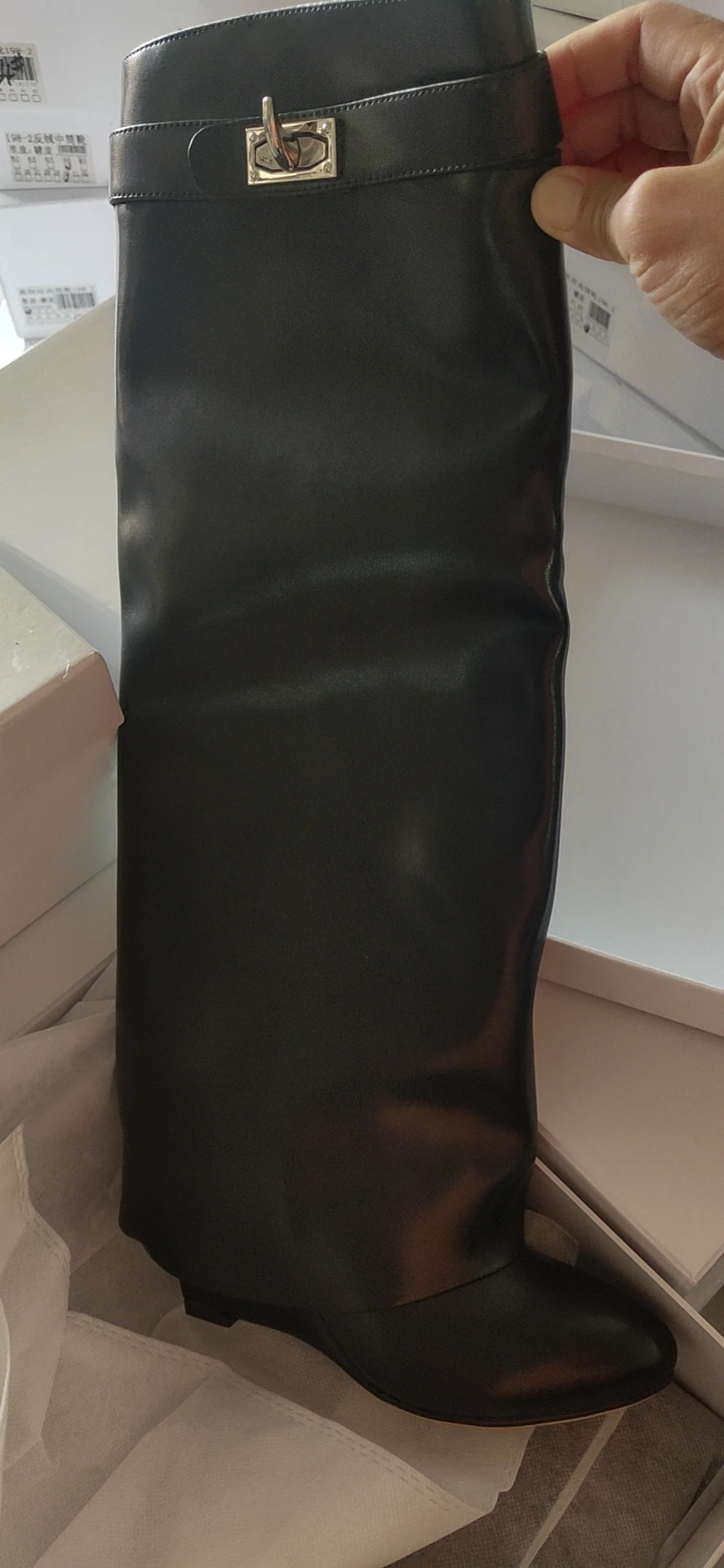 Серебристые сапоги до колена с металлическим замком «Акула»; Белые женские кожаные сапоги на танкетке с острым носком; Обувь на высоком каблуке; Сапоги выше колена