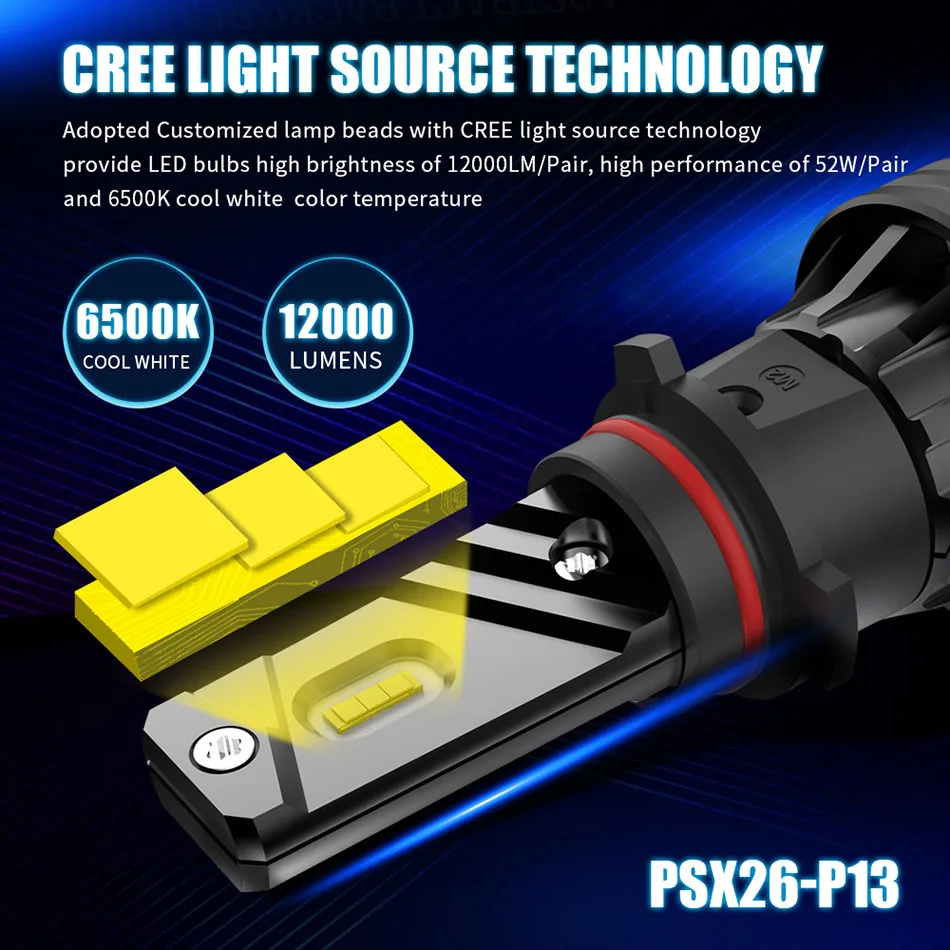 Модель: P13W PSX26W SP13W Входная мощность: 60 Вт/за пару, 30 Вт/за лампу Рабочее напряжение: 9-32 В постоянного тока (подходит для транспортных средств 12 В, 24 В) Световой поток: 12000 лм/на пару, 6000 лм/лампа Уровень IP: IP67 водонепроницаемый Установка: просто подключи и играй Светодиодный чип: AILEO, индивидуальный CSP чип высокой яркости (не обычный CSP) Цветовая температура: 6000 К белый Гарантия: 2 года