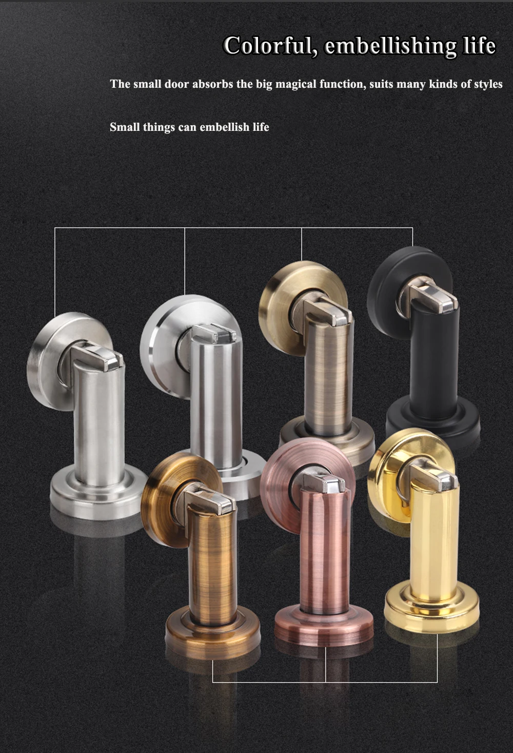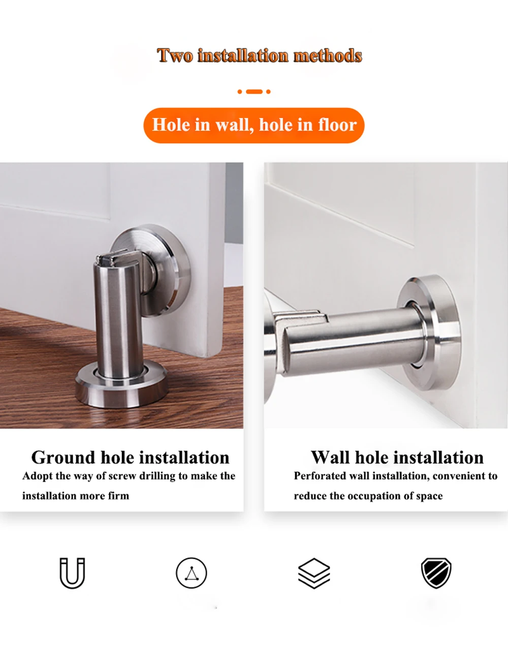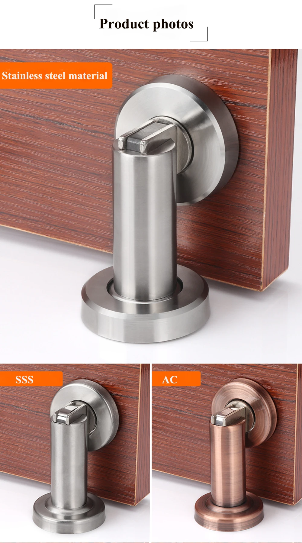 Особенности: 100% брендовый тяжелый и высококачественный Это резиновая дверная пробка из нержавеющей стали Он останавливает дверь от хлопывания от ветра. И конечно Дети от захлопывания двери в стену! Резиновый дверной держатель состоит из двух частей: фитинга пола и дверного фитинга Характеристики: Материал: нержавеющая сталь Цвет: SSS/черный/AB/AC/Gold Размер: Смотрите следующую картинку Подходит: любые двери Содержание упаковки: 1 х дверная пробка (с аксессуаром)