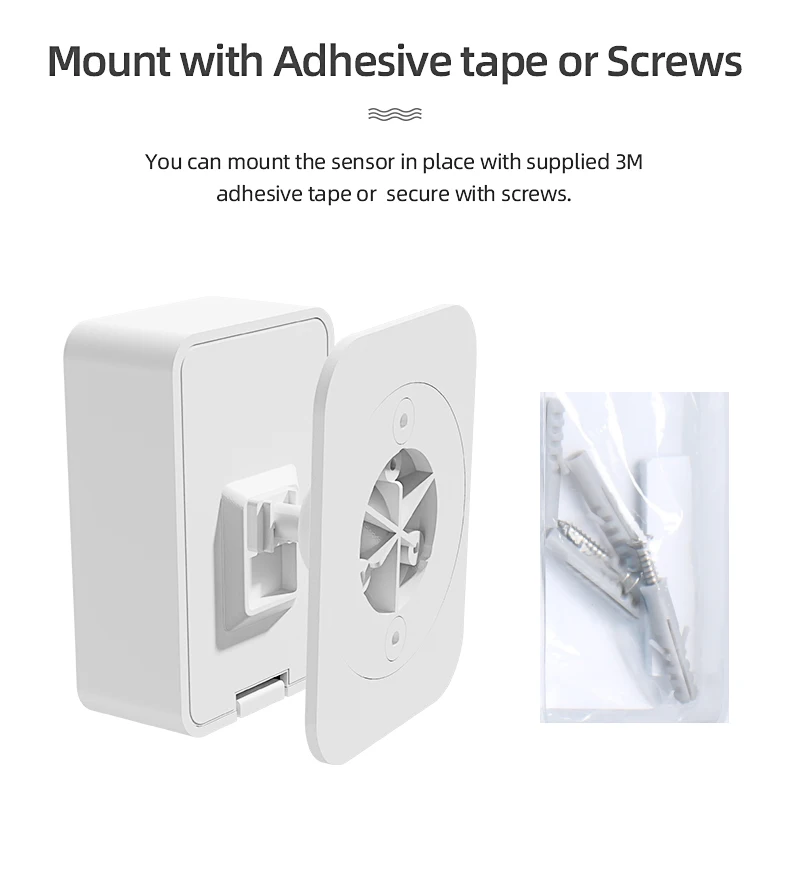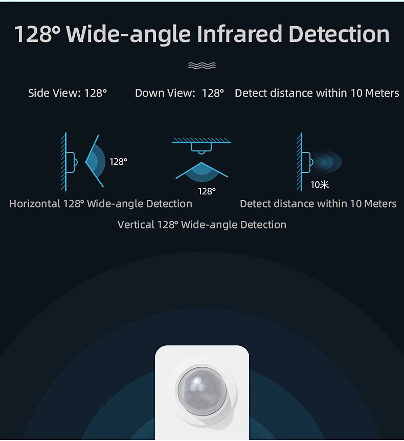 Тип батареи: LR6-1.5V/AA * 2 (щелочная батарея), не входит в комплект Микро вход: 5 В/1 А постоянного тока Ток в режиме ожидания: ≤ 51uA Светодиодный индикатор: красный Угол обнаружения: 128 ° Диапазон обнаружения: ≤ 10 метров Wi-Fi частота: Wi-Fi 2,4 ГГц Стандарт WiFi: IEEE 802,11 b/g/n Рабочая температура: 0 ℃ ~ 50 ℃ Рабочая влажность: 10% ~ 85% относительной влажности Температура хранения: 0 ℃ ~ 70 ℃ Влажность хранения: 5% ~ 95% RH (без конденсации) Материал: АБС-пластик Размер: 70x45x35.6 мм Патент № 202030439417,4 Код HS 8531901000 Применение: Tuya Smart или Smart Life