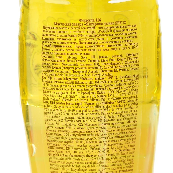 Масло для быстрого загара "Янтарная дыня", с увлажняющим действием, SPF 12, 135 мл
