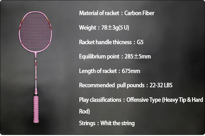 Вес-5U вес нетто всего 78± 3G без струны, накипи и пластиковой пленки, любой может контролировать ракету без усилий;Углеродное волокно-он ракетка более легкая, но более сильная, поэтому напряжение может достигать 32 фунтов, подходит для начинающих и профессиональных игроков;Баланс ракетки-ракетки имеет лучший баланс веса и мощности, поэтому ракетка может легко сломать силу и сделать наступление не может быть остановлен.Бесплатное обслуживание-мы можем предложить бесплатное обслуживание струны и накладки, так что вы можете играть сразу же, когда вы получите ракетку.Подарок:1-бесплатное обслуживание струн с помощью цифровой струнной машины;2- 1 шт. Удобная цветная накладка;3-1 шт. сумка для переноскиIt works well. please send the instruction manual.... Читать отзыв полностью...