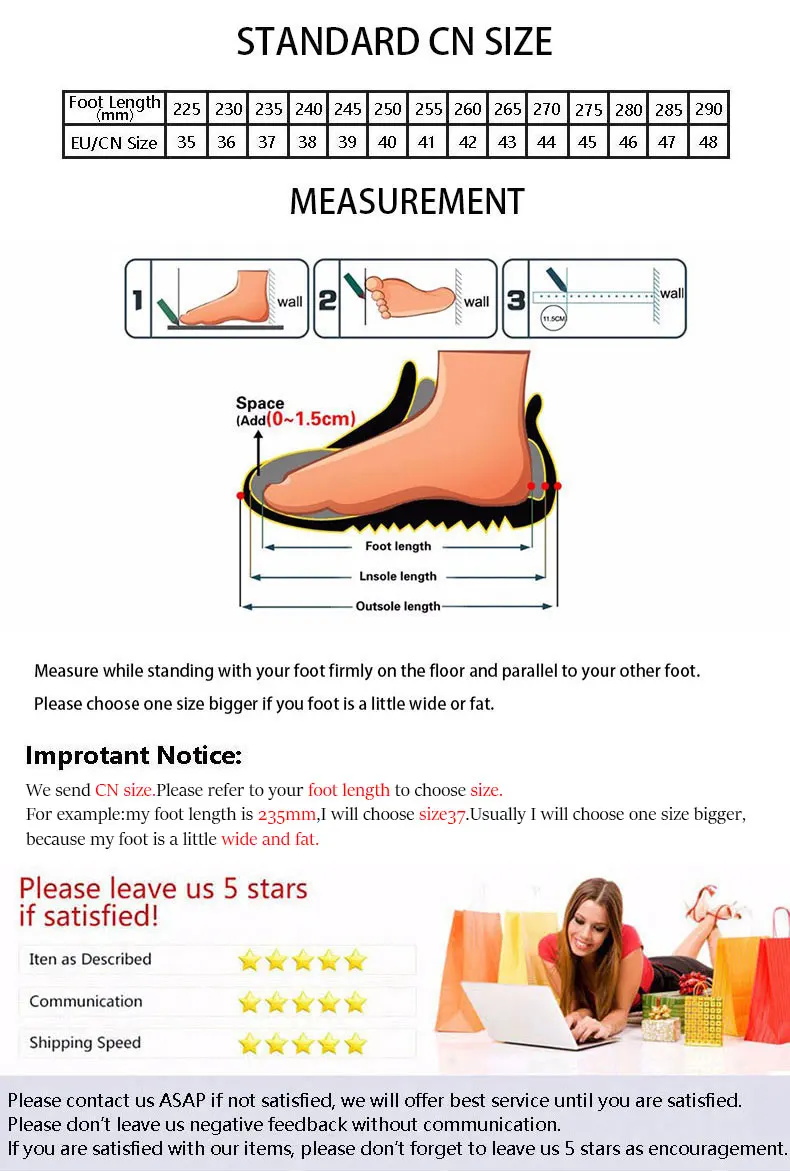 1. Пожалуйста, выбирайте подходящий размер в соответствии с нашей таблицей размеров! Это очень важно! Допускается погрешность в измерениях ± 5 мм. Если у вас широкая или Толстая стопа, пожалуйста, выберите на один размер больше. 2. Из-за различных настроек монитора и освещения изображения могут отличаться от реального товара. Но мы гарантируем, что стиль такой же, как на изображениях. 3. Обувь промышленная, а не художественная. Тонкие линии, небольшие пятна, небольшая разница в цвете и запах микрогеля неизбежны. Пожалуйста, поймите. 4. Пожалуйста, свяжитесь с нами как можно скорее, если вы не удовлетворены нашим товаром, мы ответим в течение 12 часов и предложим лучший сервис, пока вы не будете удовлетворены. Пожалуйста, не оставляйте нам отрицательные отзывы или открывайте спор без общения. 5. Если вы удовлетворены нашими товарами, пожалуйста, не забудьте оставить нам 5 звезд в качестве обода. Спасибо за понимание и сотрудничество. Желаем вам приятных покупок.
