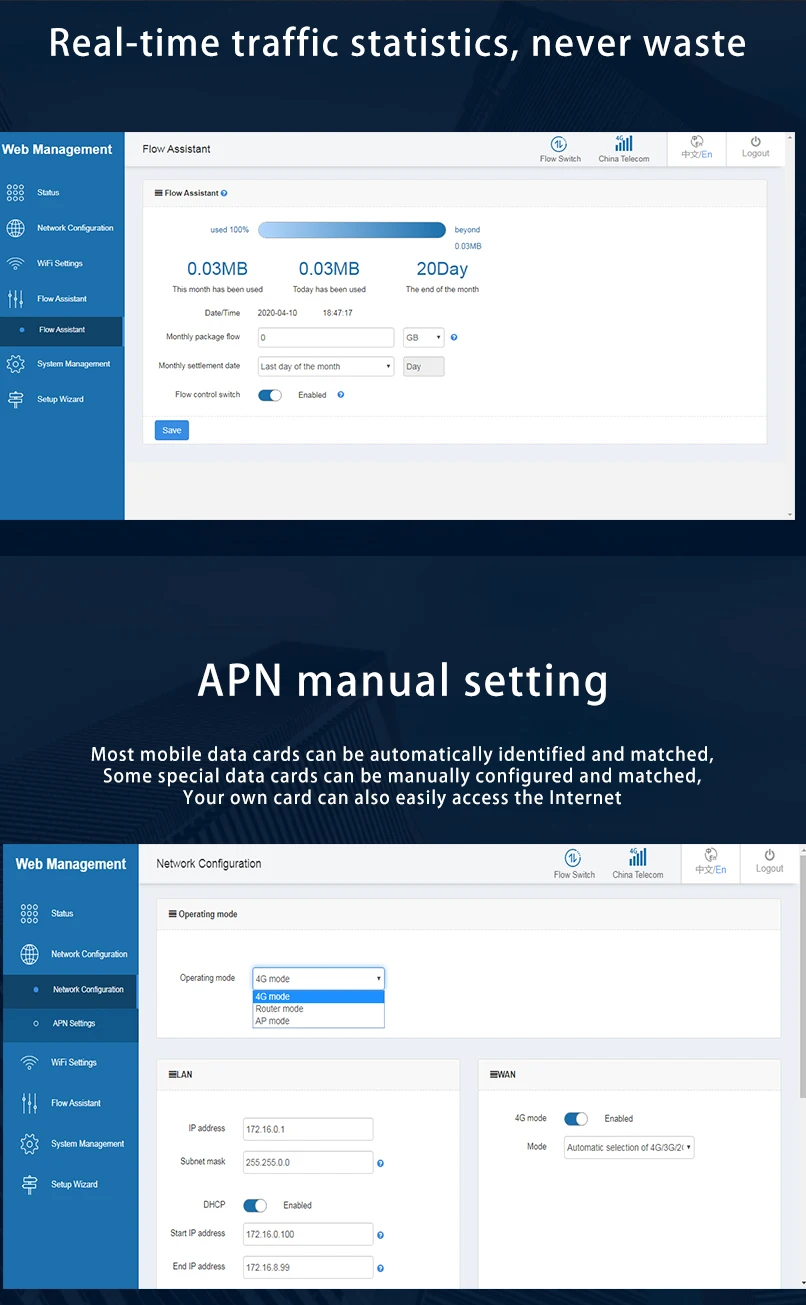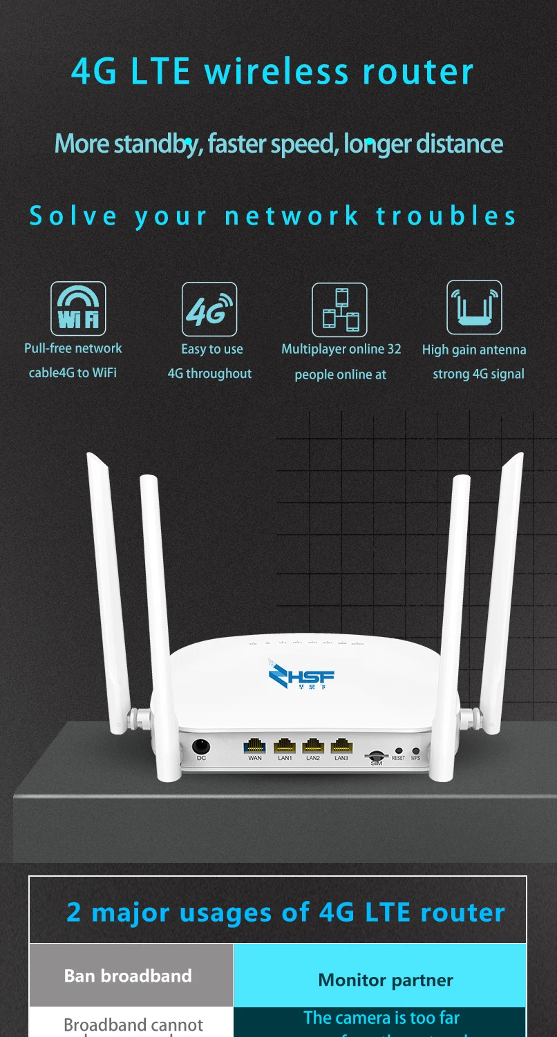 a new 4G LTE CPE with LTE technology. The router is mainly aimed at the office, home and IoT. It provides high-speed and reliable routing and data transmission capabilities,to meet their different application scenarios. Asia 4G Version For Thailand / Korea / India Supports FDD Band: B1/B3/B5/B8 Supports TDD Band: B38/B39 /B40 /B41 Supports 3G WCDMA: B1 2100MHZ EU 4G Version For Europe/ Middle East / Africa / Thailand / Korea / India / Australia /New Zealand LTE-FDD: B1/ B3/ B5/ B7/ B8/ B20 LTE-TDD: B38/ B40/ B41 WCDMA: B1/ B5/ B8 USA 4G Version: B1/B2/B4/B5/B8/B17 For North America and South America MTK7628KN CPU, Memory:8MB , 4G Module:LTE CAT4, Flash:2MB , Support 4*10/100/1000Mbps RJ45, Support multi-carrier (2G/3G/4G LTE), External reset button, Power supply:DC 12V 1A, Support external LED indicator, Button:Power,Reset,WPS, Support external antenna:2*WIFI+2*LTE, 5dBi gain. Highlight 1*10/100/1000Mbps RJ45 WAN 3*10/100/1000Mbps RJ45 LAN 1*SIM Card Throughput:LTE CAT4 FDD-LTE 150Mbps/50Mbps Support Multiple Internet Connect:2G 3G,4G,PPPOE,APN Radio rate up to 300Mbps,support wireless security functions Support SIM lock card and traffic statistics Benefit Wireless WAN Connectivity High-speed & High-efficiency The 4G router enables easy-to-install wireless connectivity in small business or remote office locations. Ideal for small businesses ,home ,offices and mobile networks; the 4G router provides wired Ethernet, and 3G/4G wireless WAN connectivity to keep you and your business up and running. Secure and Reliable a-LAN connections are protected with advanced WiFi encryption. b-Main office access and business transactions are protected by VPN capability, and other security features to ensure your network stays secure. c-Designed for small office/home /IoT/Securitydeployments. Internet and home phone service all in one Get internet and home phone service all in one device with the 4G LTE Broadband Router with Voice. Whether you need high-speed internet and/or phone connectivity at home or away, this router securely connects multiple devices wherever there is a 4G LTE signal.