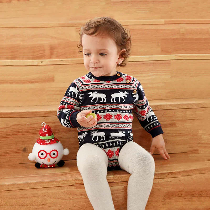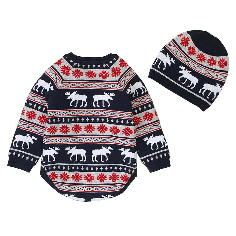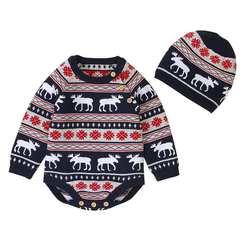 Комбинезон унисекс с оленем для маленьких мальчиков и девочек + шапка с принтом; Рождественский вязаный свитер; Костюмы ♀Материал: хлопок ♀Посылка: 1 комбинезон с длинными рукавами, 1 шапочка с принтом ♀Размеры: 70/80/90/100, который подходит для детей от 0 до 18 месяцев, для маленьких мальчиков и девочек, для детей ясельного возраста; Для младенцев ♀Дизайн с пуговицами, легко надевать и снимать ♀Детские свитера унисекс с милым рисунком оленя в полоску со снежинками