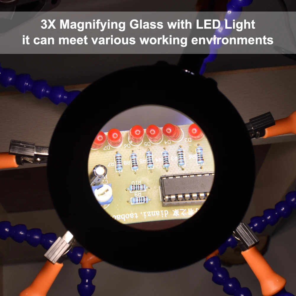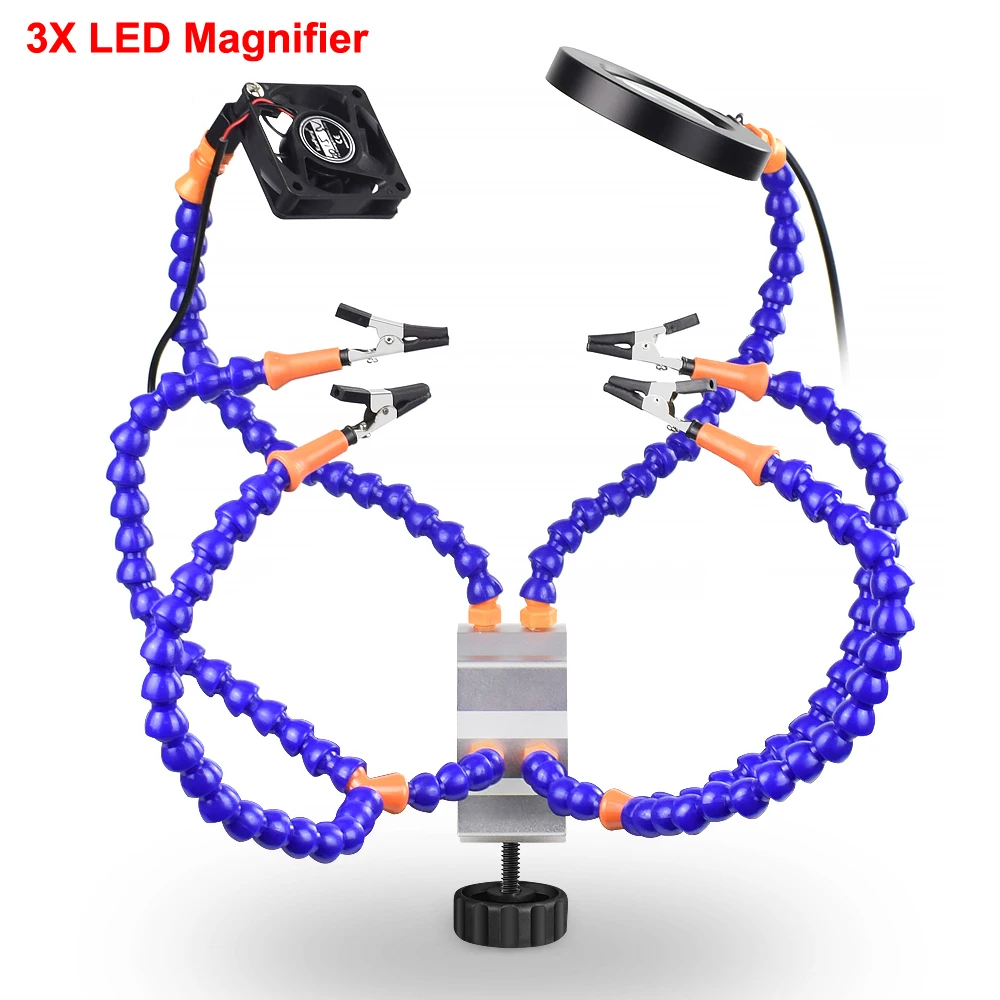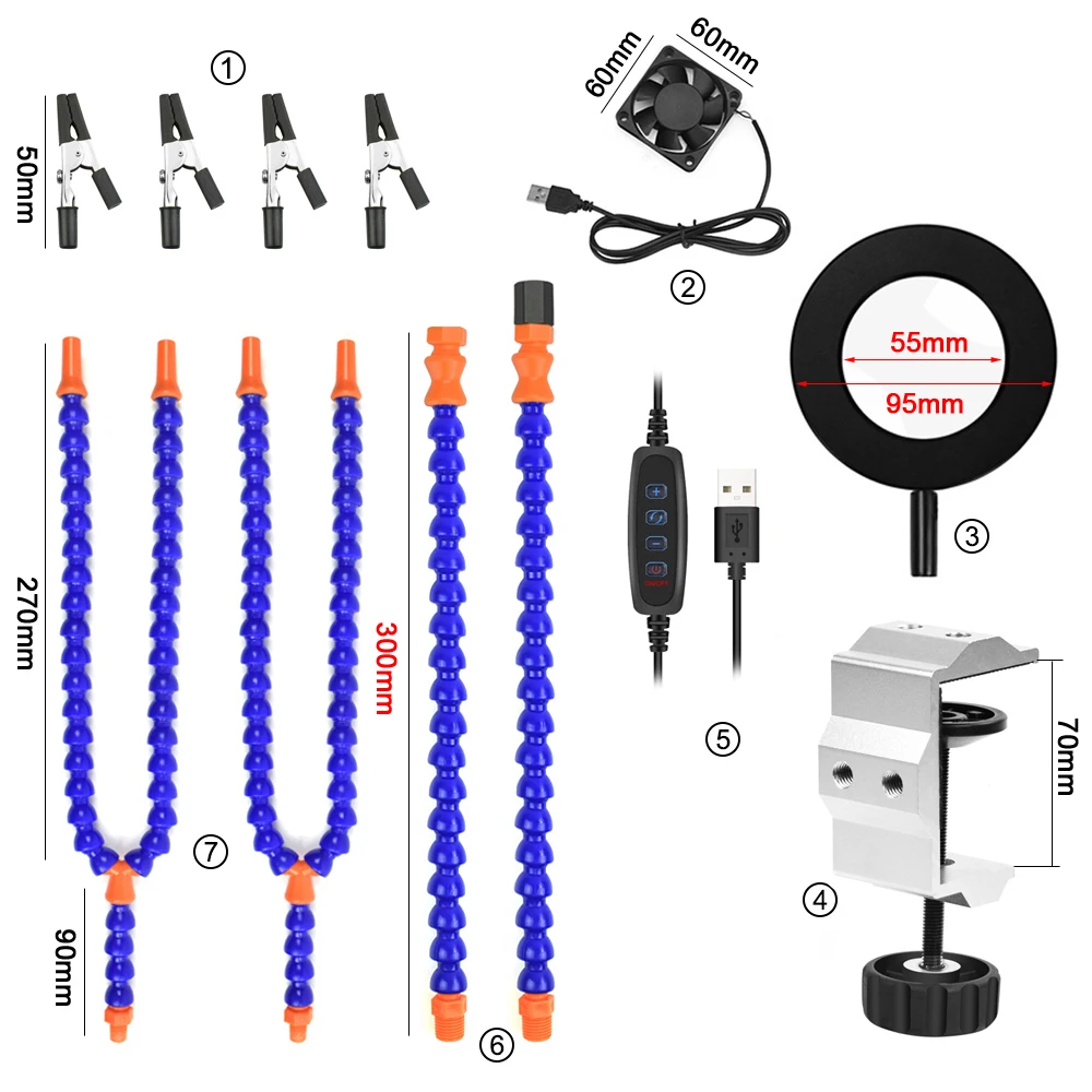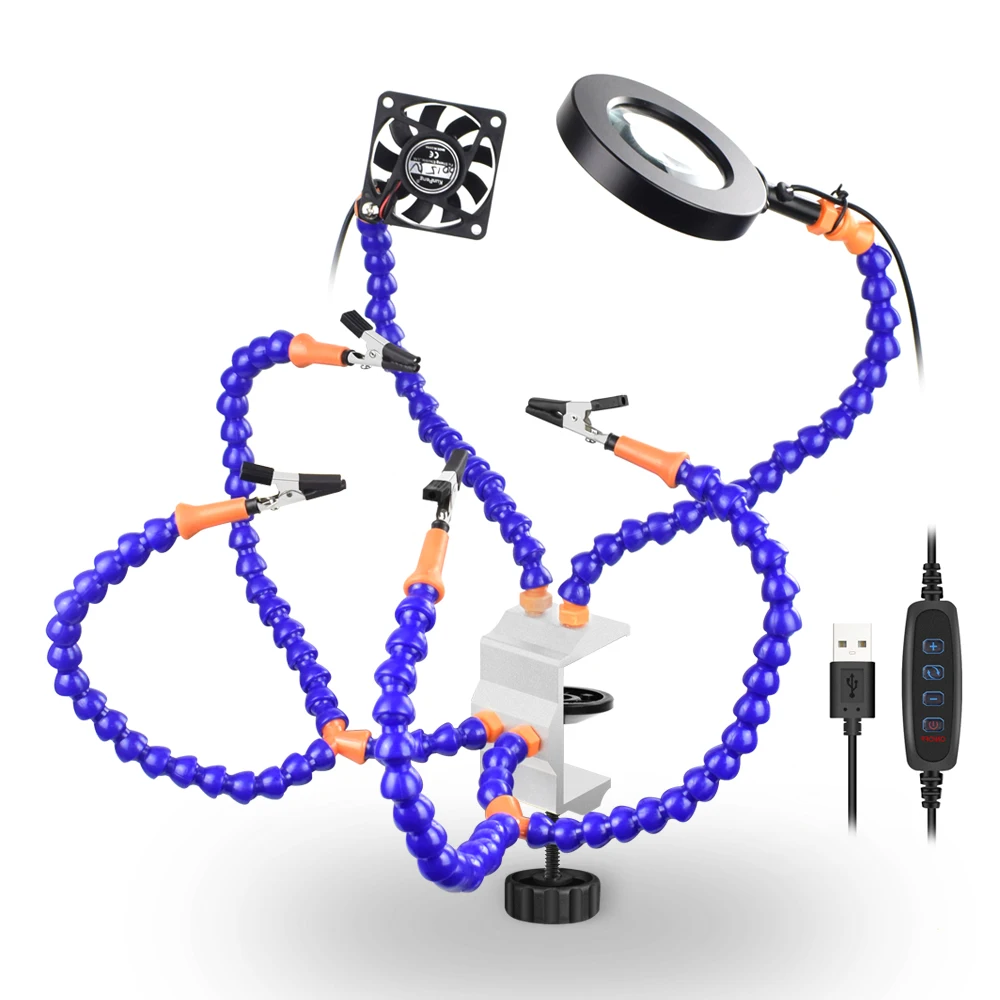 5. Гибкие ручки с зажимами типа «крокодил», 1 шт. увеличительное стекло 3X-5X, 1 шт. 1X-4X масштабируемый перезаряжаемый usb-фонарик, 1 шт. бесщеточный вентилятор USB DC, можно снять зажим/увеличительное стекло/фонарик.