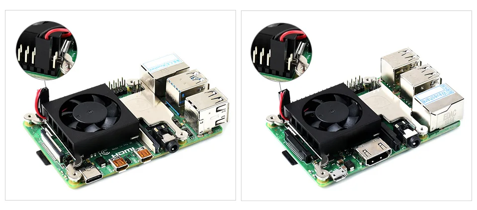 Пример установкиОхлаждение Raspberry Pi 4B (слева) и Raspberry Pi 3B +/3B (справа)