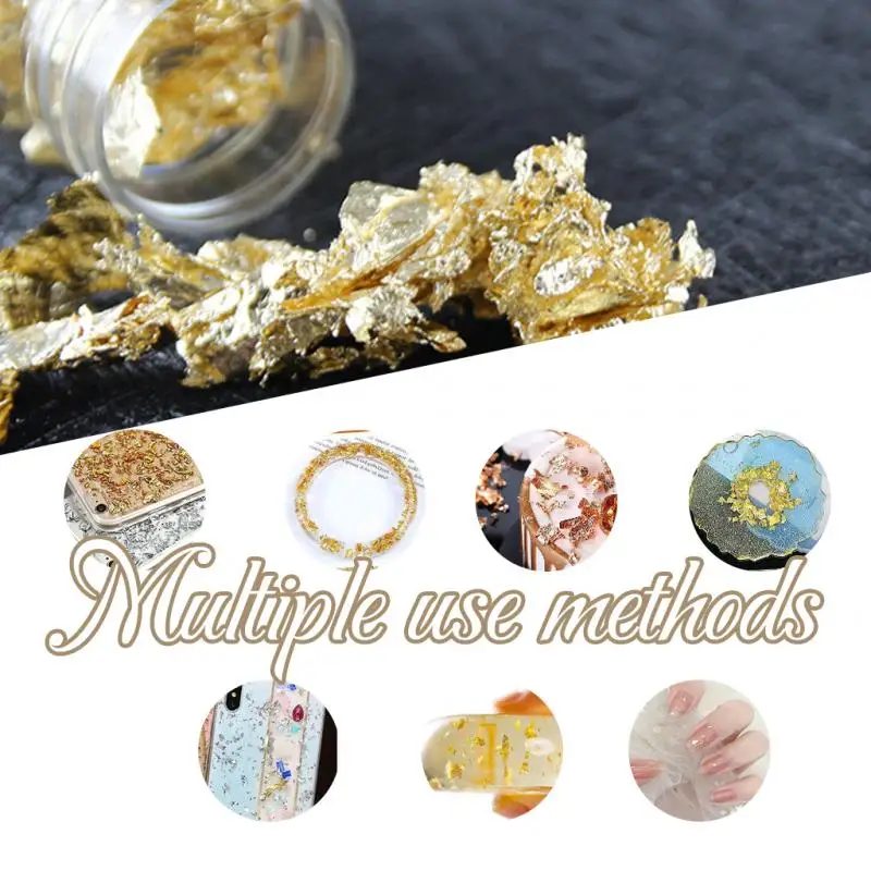 3. Яркие цвета-поставляются с золотыми, серебряными и медными цветами, хлопья из золотой фольги не легко выцветают и окисляются, они могут создать потрясающий Блестящий текстурированный эффект, чтобы ваши поделки выглядели особенными.