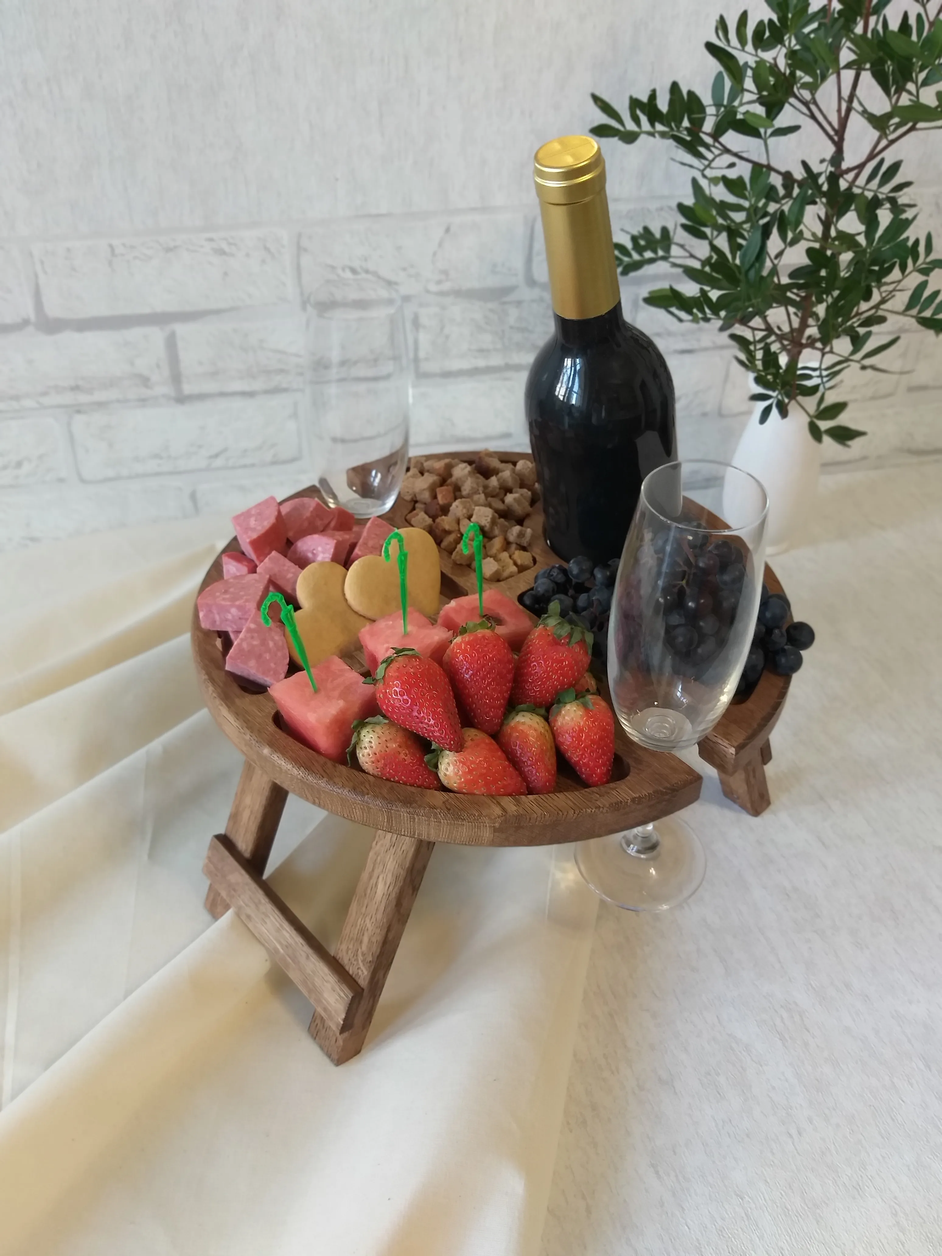It's nice to spend an evening with your beloved half or in the company of friends over a glass of good wine. A wine table will help make the evening even more cozy. This is a great gift for any occasion. The table is made by hand from natural wood and with great love. It is very compact and has folding legs, which makes it even more convenient.