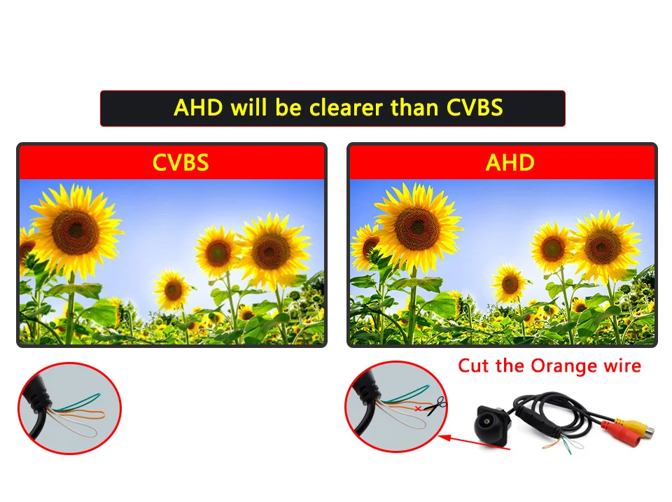 * Поддержка AHD и CVBS видеосигнала --- эта Автомобильная камера заднего вида может работать как с мониторами Cvbs, так и с мониторами AHD. Выходной видеосигнал является стандартом CVBS, если вы подключите его к монитору CVBS, отрежьте Оранжевый кабель на камере и повторно подключите источник питания.