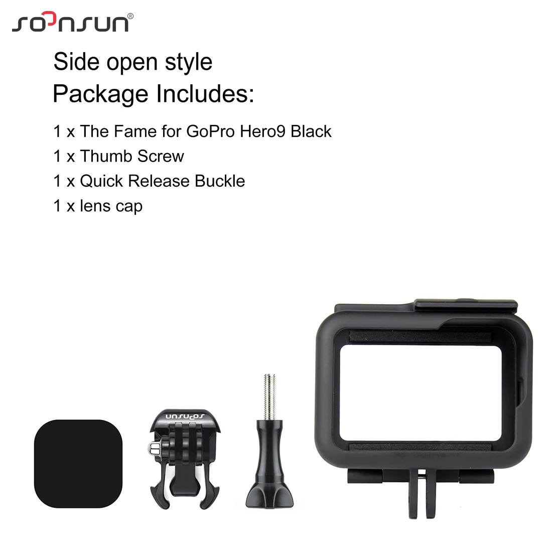 Рамка с боковым открытым дизайном для GoPro Hero 9 x1 Быстроразъемной пряжкоймарки x1 Винт с накатанной головкой x1 Крышка объектива x1