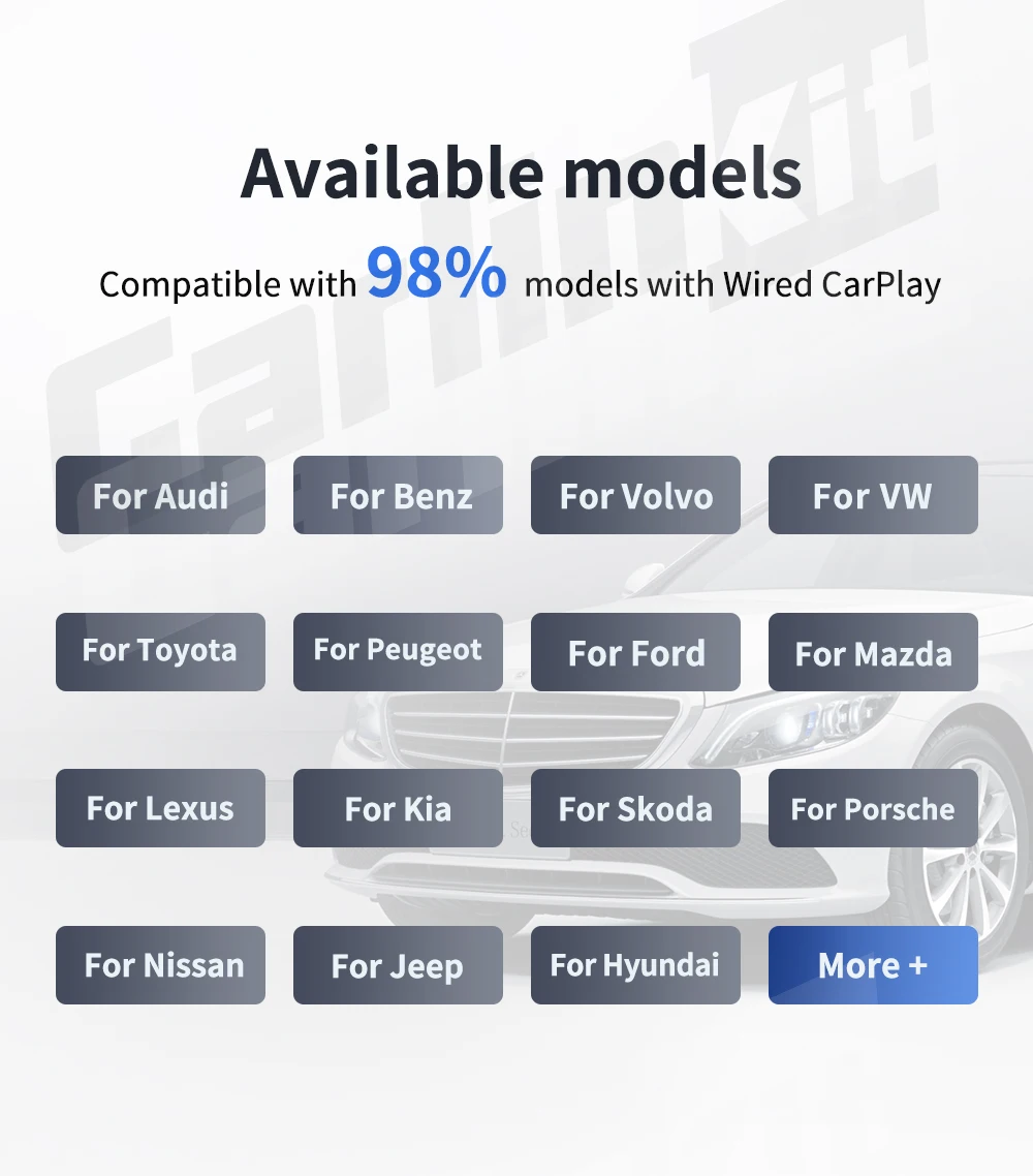 1. Новая версия: Carlinkit Wireless Carplay Activator Mini USB Dongle/пусть оригинальный автомобиль, встроенный в apple carplay, подключен к беспроводной carplay. (Больше моделей автомобилей и лет, пожалуйста, обратитесь к продавцу.)