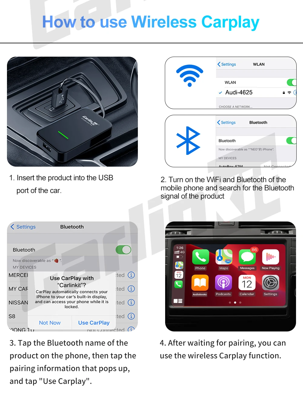 3. Совместимые устройства-: только поддержка моделей автомобилей с оригинальной CarPlay. Если вы хотите использовать ваш carplay по беспроводной связи, вы можете купить наш продукт. Наслаждайтесь вашим беспроводным автомобилем.