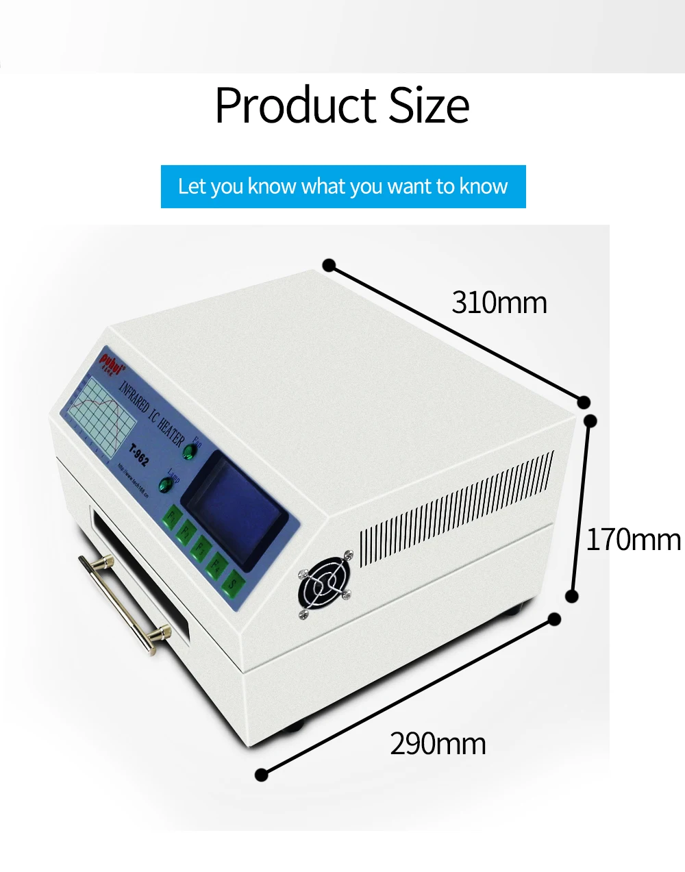 (1) большая Инфракрасная паяльная зона. Эффективная площадь пайки: 180*235 мм; Это значительно увеличивает диапазон использования этой машины и делает ее экономичной.