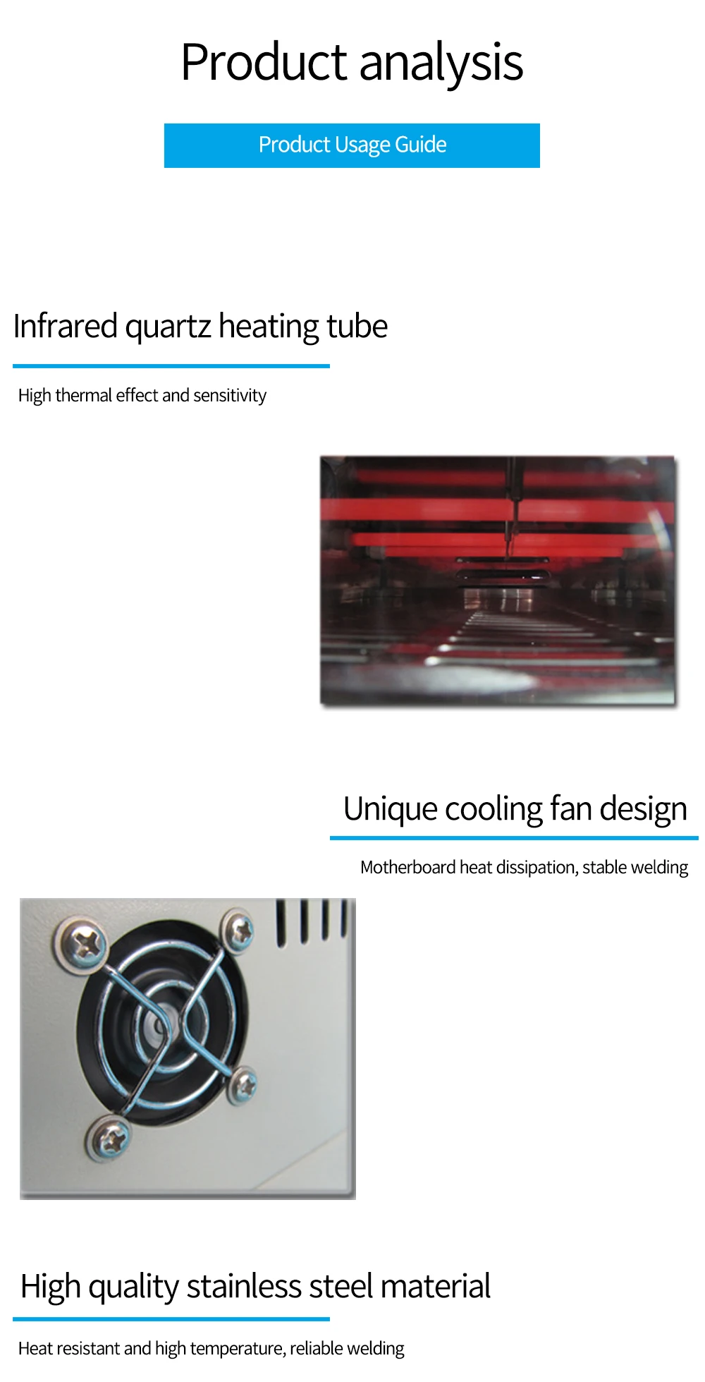 (3) Специальный нагрев и выравнивание температуры со всеми дизайнами. Использует до 800 ватт энергоэффективного инфракрасного нагрева и циркуляции воздуха для повторного потока припоя.