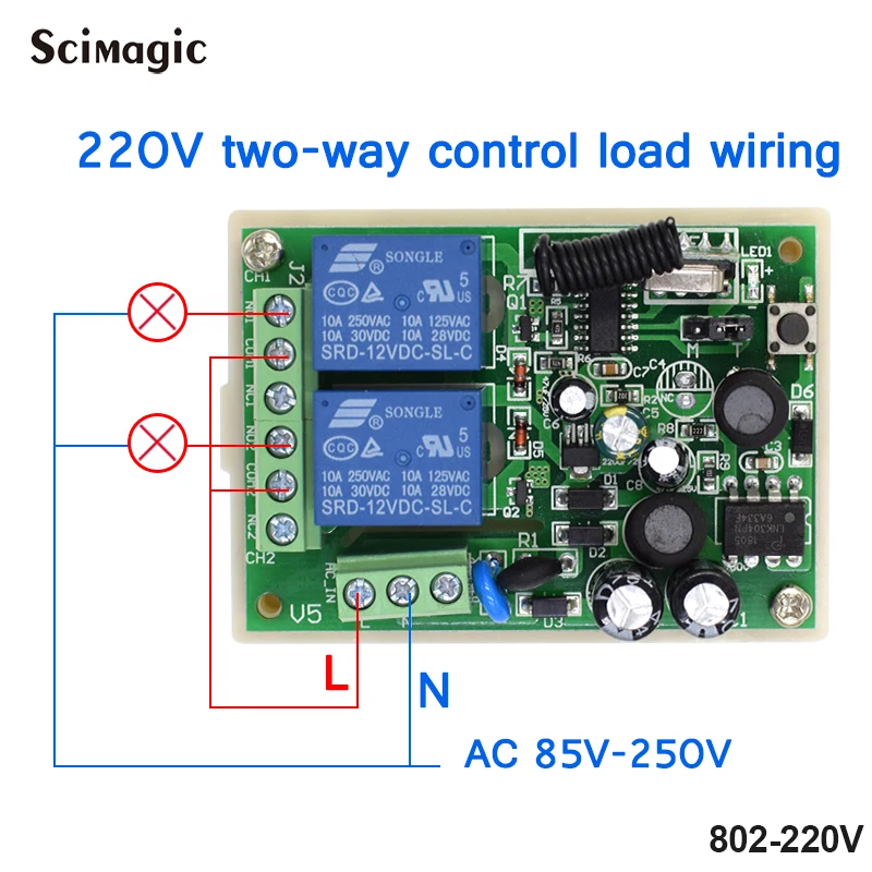 Номер модели: SMG-802-220V Тип товара: двухканальный пульт дистанционного управления Тип кодирования: Интеллектуальный обучающий код Режим работы RF: Супергетеродинный прием Режим модуляции: ASK Режим работы: Мгновенный, переключаемый и блокирующий режим. Частота RF: 433 МГц Входное напряжение: 85 В ~ 250 В переменного тока Ток в режиме ожидания: <8.5ма Чувствительность приема: >97dbm Диапазон дистанционного управления: >50 м (свободное пространство) Проводной способ подключения: фиксированный столб проводки Выходной терминал: нет, COM, NC Выход ВКЛ-ВЫКЛ (проводной порт): Нет (обычный открытый), COM (общий конец), NC (обычно закрытый конец). Цвет: зеленый (печатная плата), белый (внешняя оболочка) Монтажная плата Размеры: 7,3*5,2*2,5 см
