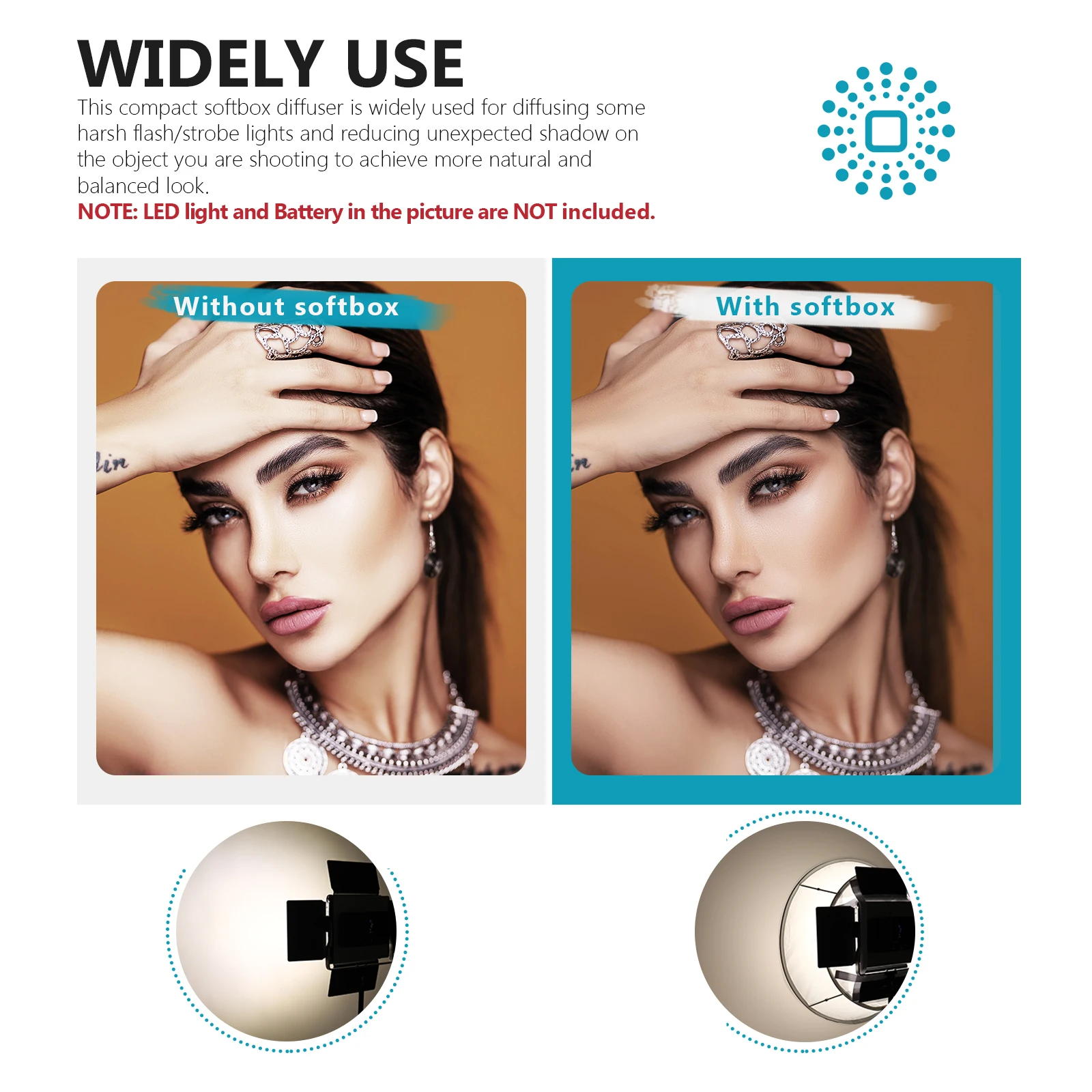Этот компактный рассеиватель софтбокса широко используется для рассеивания жесткой вспышки и уменьшения неожиданных теней на объекте, который вы снимаете, для достижения более естественного и сбалансированного вида.